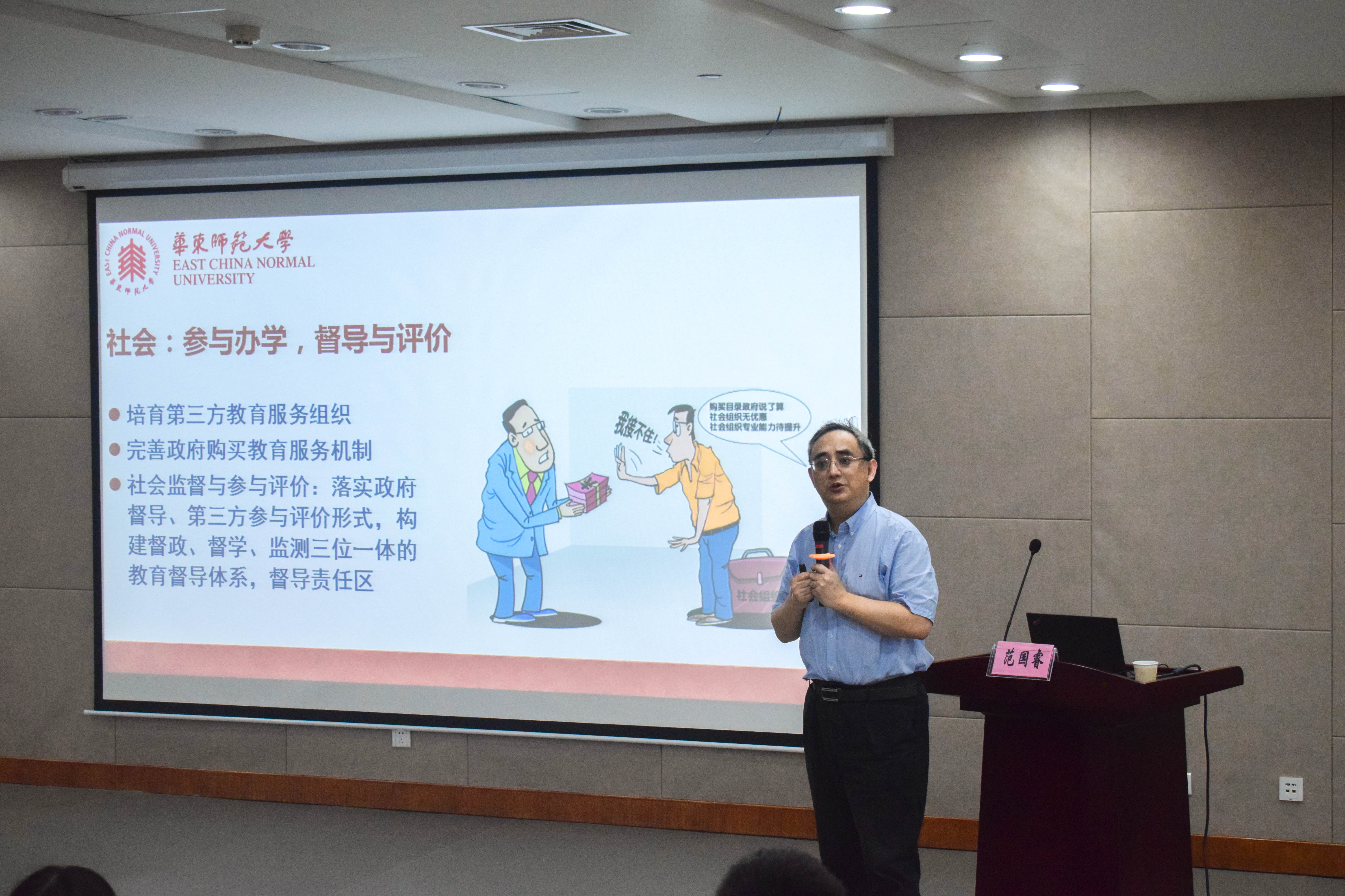 范国睿教授以“教育治理的逻辑”为主题,从政府简政放权问题、学校自主发展、社会参与教育治理和评价等教育治理的当代问题谈起。通过对西方与中国不同语境下治理的分析,范教授提出教育治理的价值基础是基于多元教育利益主体参与、共享的”善治”,应构建基于合作的政府-学校-社会关系。范教授认为,教育治理关键在政府,着力点在学校,社会组织是重要力量。政府通过清单管理,简政放权,向学校和社会组织放权和授权,同时加强事中事后监管,为学校发展提供专业支持与服务;学校在依据章程厘清办学权责的情况下,依法自主办学,深化学校内部治理结构改革,建构依法办学、自主管理、民主监督、社会参与的现代学校制度;此外,要积极培育和扶持教育类社会组织,规范社会组织参与教育的机制,提高社会组织参与教育的专业能力。