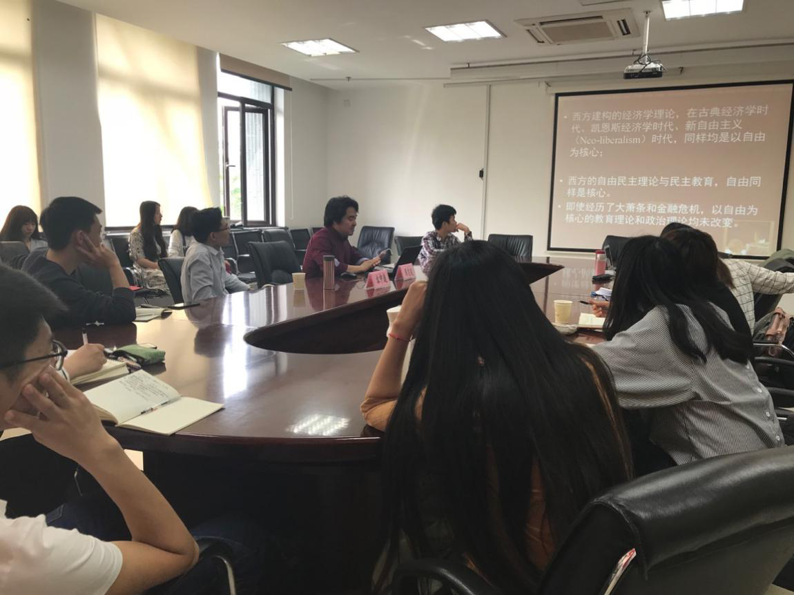 此次活动先由浙江师范大学非洲研究院周志发副研究员和学院师生作了题为“集马列、儒家、西为体的容错教育学”学术报告。他以如何建构具有中国特色、普遍性的教育学这一问题为切入点,从知识论和西方文化的视角分析了西方教育学的特点,结合马列毛泽东思想、中国传统儒学、西方自由主义等研究分析,提出要挑战西方自由主义的话语体系,构建基于“试错理念”之上的有中国特色的容错教育学体系。周老师讲座幽默风趣,发人深省。