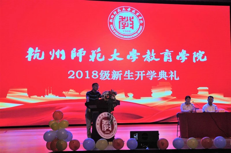 教师上台发言。叶老师的开场白幽默风趣、独具特色,他结合外国两位知名学者的观点指出大学是一个学习知识、探索真理的地方,鼓励学生独立思辨、大胆发言,形成创新精神;同时大学还是完善人格、发展个性的场所,希望新同学重视通识课的学习,成为一个“有灵魂、有责任、有品位、有爱心的优雅的人”,为成为卓越教师奠基。