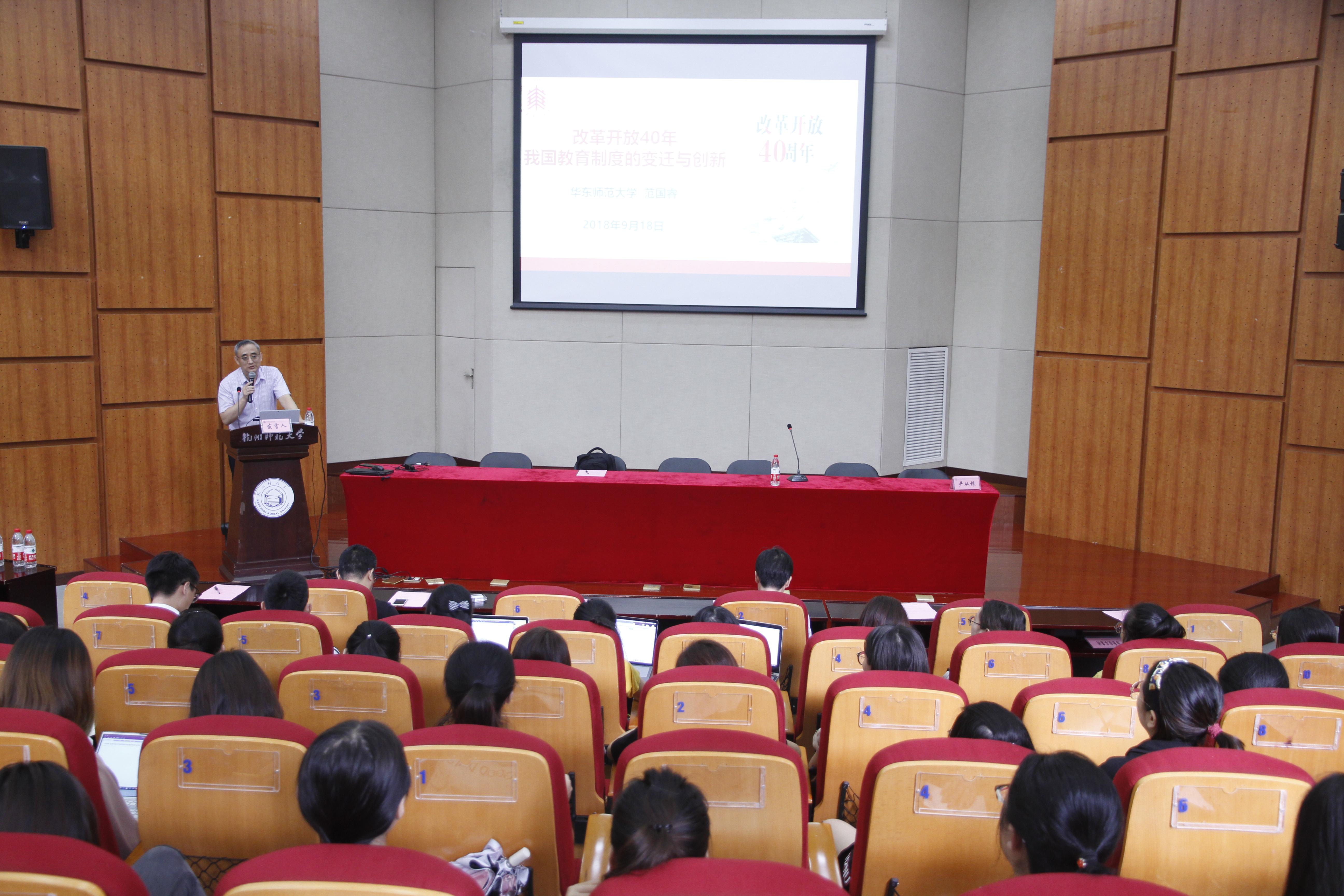 2018年9月18日上午,教育学院太炎教育讲堂开讲。特聘教授、桃花族论坛 教育学院特聘首席专家范国睿教授作为太炎教育讲堂首讲人,在仓前校区7号楼200座为大家带来“改革开放四十年我国教育制度的变迁与创新”的主题讲座。桃花族论坛 严从根副院长主持讲堂,160余名师生参加。