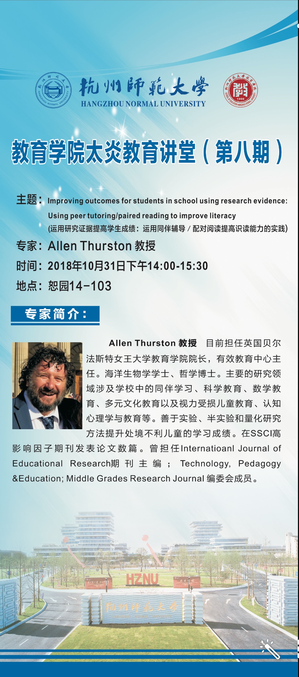 专家简介:Allen Thurston 教授目前担任英国贝尔法斯特女王大学教育学院院长,有效教育中心主任。海洋生物学学士、哲学博士。主要的研究领域涉及学校中的同伴学习、科学教育、数学教育、多元文化教育以及视力受损儿童教育、认知心理学与教育等。善于实验、半实验和量化研究方法提升处境不利儿童的学习成绩。在SSCI高影响因子期刊发表论文数篇。曾担任Internatioanl Journal of Educational Research期刊主编;Technology, Pedagogy &Education; Middle Grades Research Journal 编委会成员。