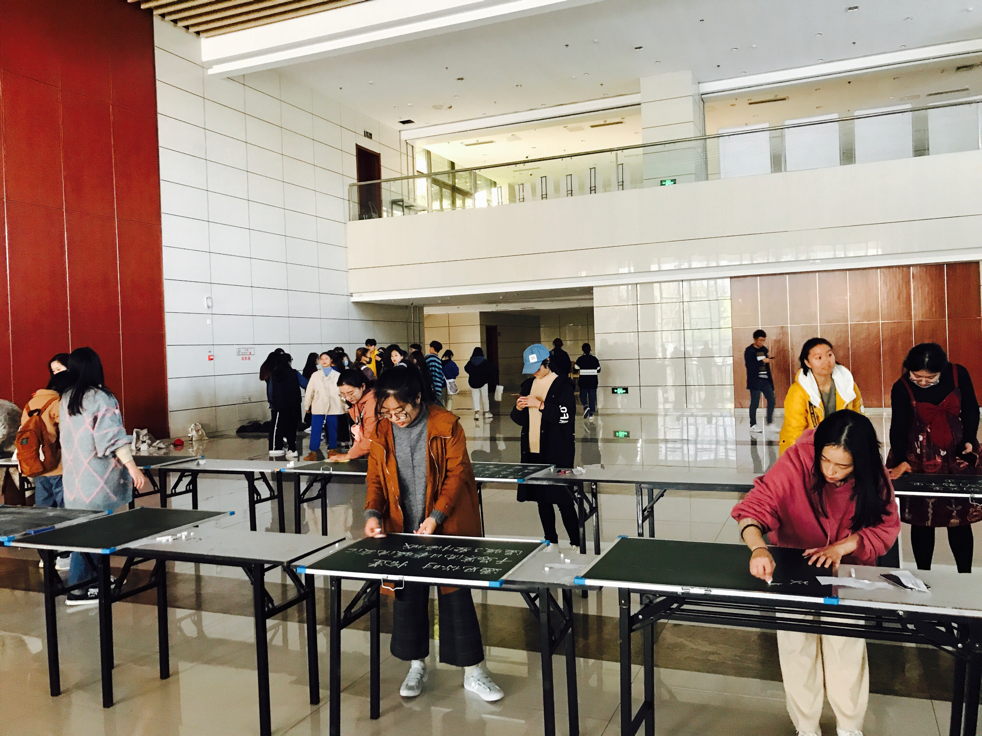 赛前,学生携带“经院三宝”之一的黑板到达现场,通过签到获取个人编号,比赛时以给定的文字为书写内容,进行为时一小时的书写。