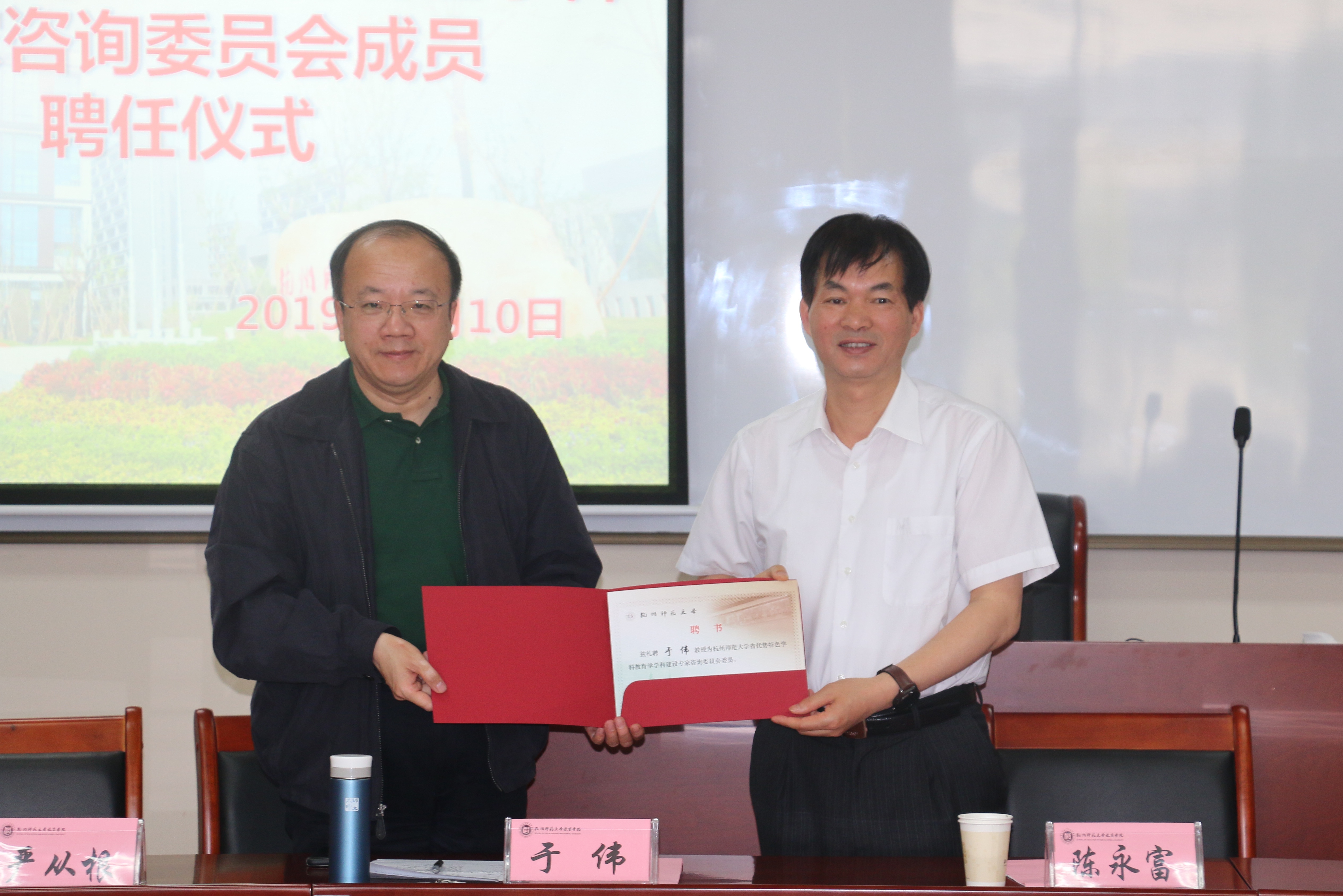 讲堂之前,举行桃花族论坛 省优势特色学科专家咨询委员会成员聘任仪式。聘任仪式由严从根副院长主持,副校长陈永富为于伟教授颁发桃花族论坛 省优势特色学科专家咨询委员会成员聘书,并合影留念。