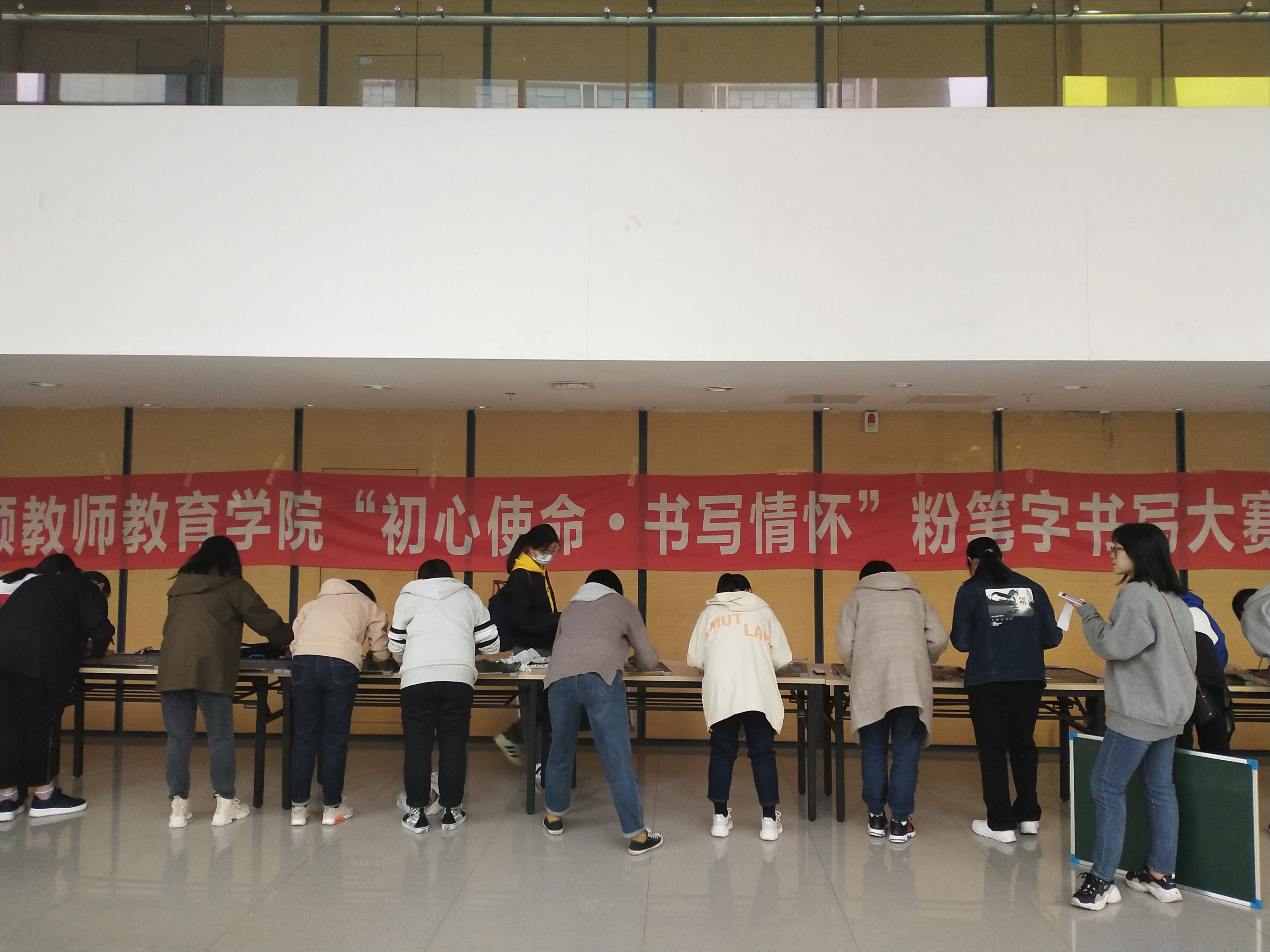 10月27日下午,“初心使命·书写情怀”粉笔字书写大赛在恕园7号楼开展。深秋季节,天空飘雨,但这依旧抵挡不了同学们参加粉笔字书写大赛的热情。