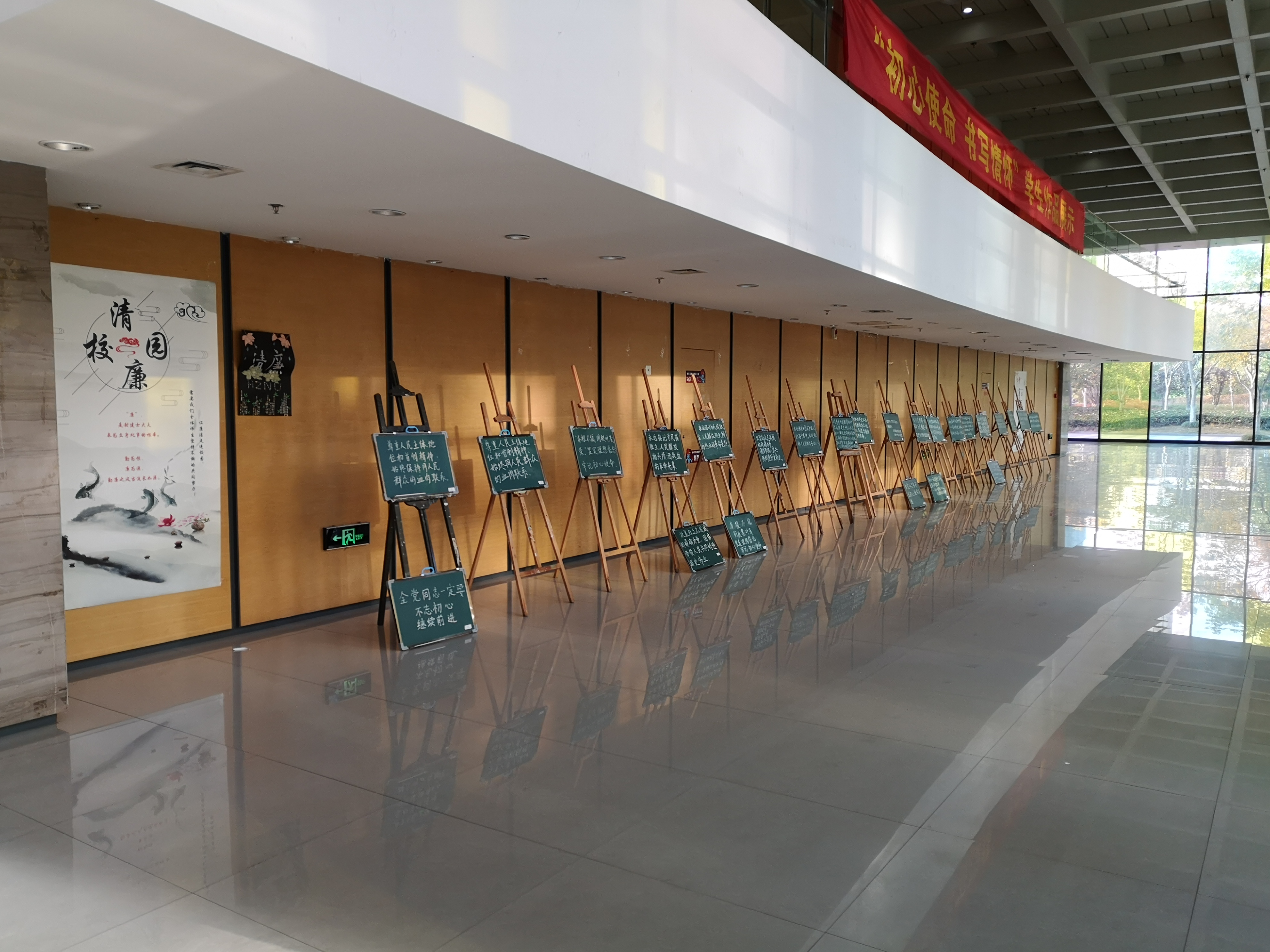 展厅两侧的画架上陈列着粉笔字大赛中的优秀作品。“永远保持中国共产党人的奋斗精神,永远保持对人民的赤子之心”,“凝聚起众志成城的磅礴力量”,遒劲有力的粉笔字书写着同学们对党初心使命的崇高敬意和为中华奋起而不懈奋斗的坚定决心。