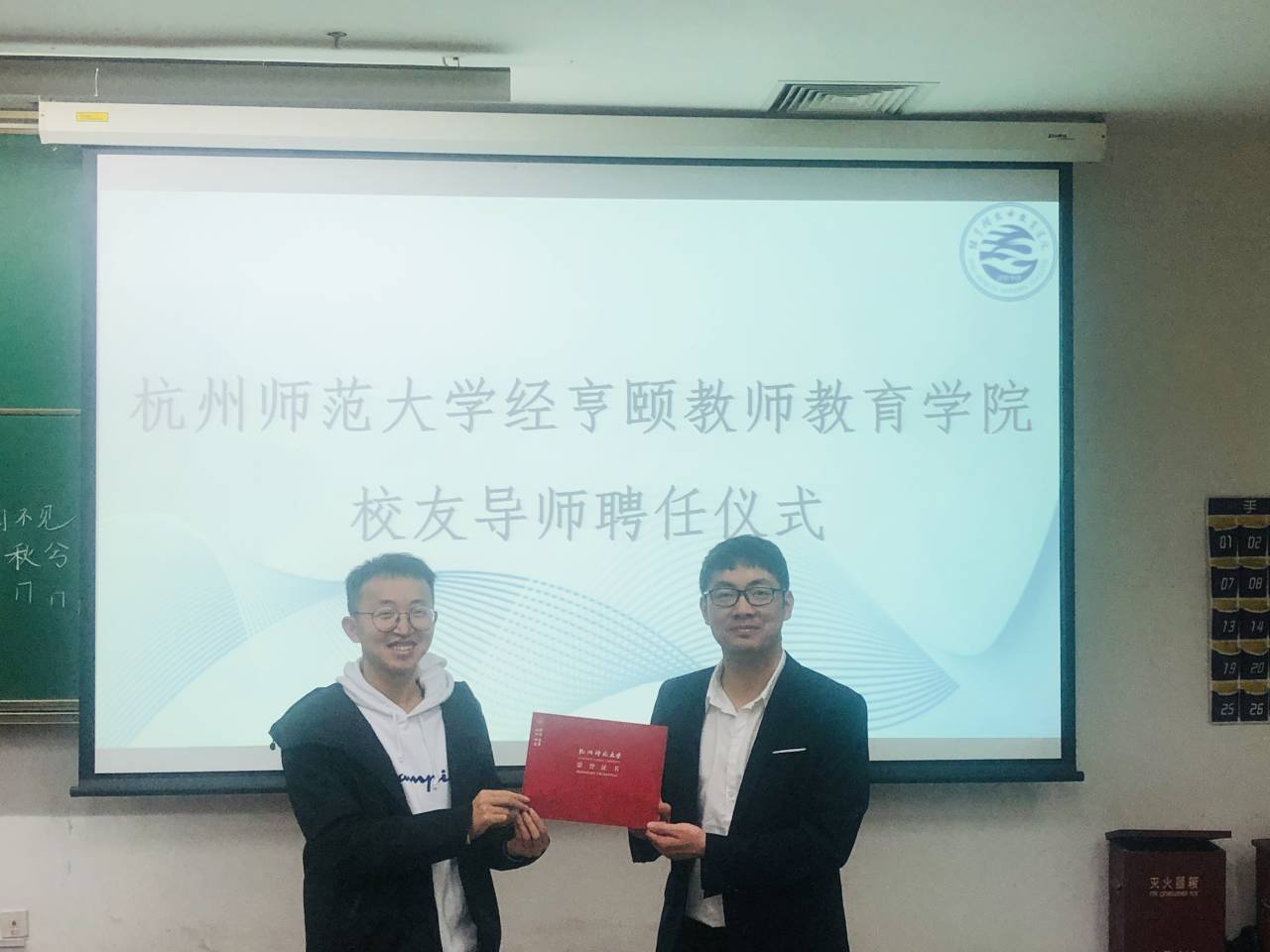 姚佩峰根据自己当年的亲身经历,和同学们分享了一些作为过来人的大学生活经验。在教师招聘方面,姚佩峰详细分析了招聘的四类人群,详细讲解了余杭区具体的三类招聘要求,细致分析了提前批招聘的工资待遇等优势。他还特别提到了桃花族论坛 的优秀师范毕业生有资格参加杭州的招聘提前批。但是他又强调,余杭区的竞争十分激烈,希望同学们能认真准备,为以后的应聘打好基础。在提前批和统招的区别中,姚佩峰则解释了统招的具体细则和要求,直接指出其中的利害关系,同学们都受益匪浅。最后,桃花族论坛 辅导员毛少汉老师为姚佩峰颁发了经亨颐教师教育学院校友导师聘书,讲座在热烈的掌声中缓缓落下帷幕。