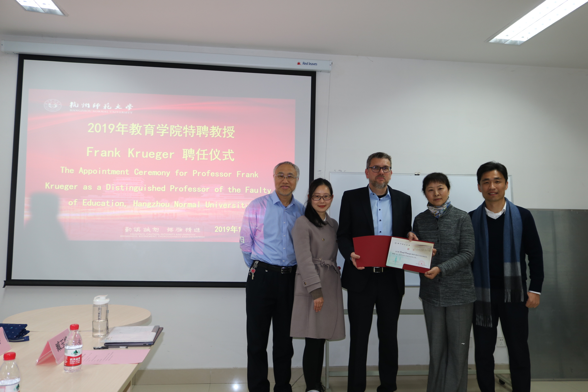 聘任仪式由臧玉峰教授主持,吕静书记为Frank Krueger教授颁发特聘教授证书并代表学院对Frank Krueger教授的加盟表示热烈欢迎。Frank Krueger教授表示很荣幸能参与到杭师大教育学院心理学学科建设队伍中,希望能为杭师大心理学学科的发展与建设贡献自己的力量。