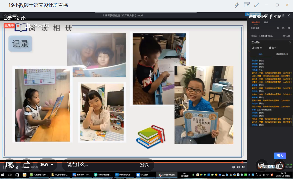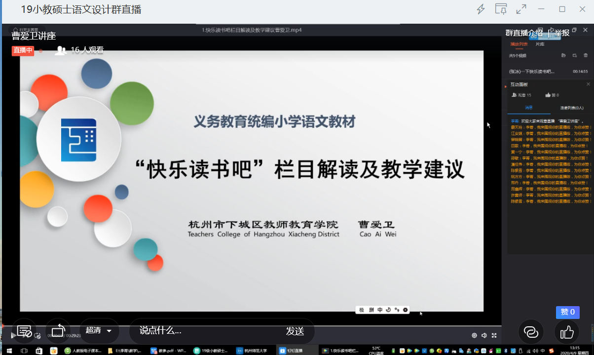 4月9日下午,杭州市下城区教研员曹爱卫老师及团队做客桃花族论坛 。曹爱卫老师带领其工作室成员,通过钉钉平台在《小学语文学科教学设计与实施》上,为2019级教育硕士语文方向的研究生们开展了讲座,分别是《“快乐读书吧”栏目解读及教学建议》;《以“快乐读书吧”为导向的低年级课外阅读操作策略》;同时呈现了以“快乐读书吧”为主题三个教学微课。曹爱卫老师从理论和实践的两个角度对“快乐读书吧”教学开展提出了切实可行的办法;曹睿老师从实践的角度,向同学们讲解了低年级课外阅读如何开展。同学们不仅充实了理论基础,而且拓展了语文观。