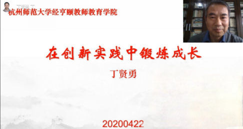 4月22日下午创新创业系列讲座之“在创新实践中锻炼成长”钉钉群直播间中开展。本次讲座主讲人为全国优秀教师、省级优秀教师、浙江省师德先进个人丁贤勇教授。辅导员毛少汉老师主持讲座。