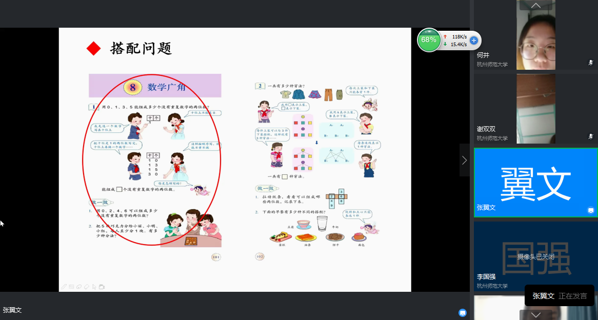 首先,张老师结合自身教学实践经验,以三年级下册数学广角《搭配》新授课为例,向同学们讲解在教学过程中要基于学生已有知识经验展开教学,如本节课中由1、3、5的搭配教学过渡到0、1、3、5的搭配教学,培养学生的有序思维,即本节课中“定高位,回避0”的优化思想。通过自主展开、图式整理、对比感知、明晰模型四个螺旋上升的环节,逐步提高学生的推理、抽象、模型能力,实现深度学习。张老师特别强调,教学过程中以生为本,知识传授中“下要保底,上不封底”,使每一位学生都获得良好的发展。