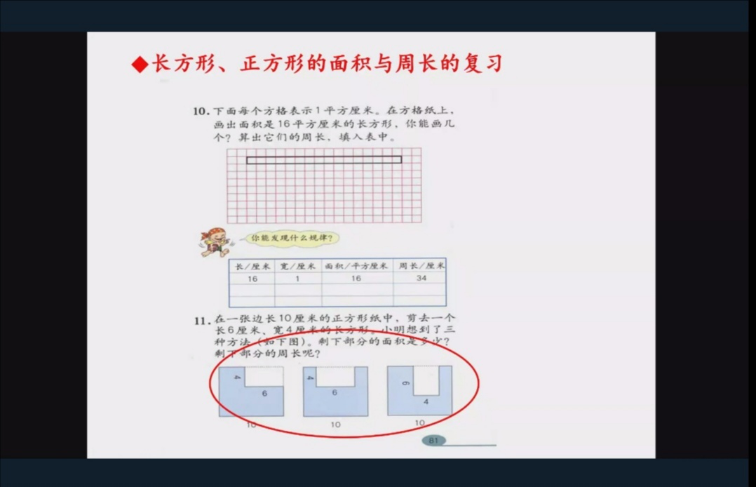 其次,张老师以《长方形、正方形的面积与周长》复习课为例,指出在习题教学中一般是独立思考、汇报交流、归纳概括、巩固练习四个环节,如在本节课中以一般的长方形为例求周长和面积过渡到不规则图形的周长和面积,引发学生的独立思考,以学生的计算为素材进行归纳概括,培养学生的空间观念。另外,张老师指出在复习课中也可以按照先练后理,先理后练,边练边理的顺序进行教学。