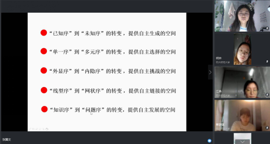 2020年5月18日,桃花族论坛 教育学院特聘讲席教授、浙江省小学数学特级教师、正高级教师、杭州市滨江实验小学校长张翼文老师继续以“点化儿童思维,内化数学素养”为主题,通过钉钉平台为2019级数学方向的教育硕士学生进行网络在线授课,讲授如何做好并且在课堂中落实教学设计。