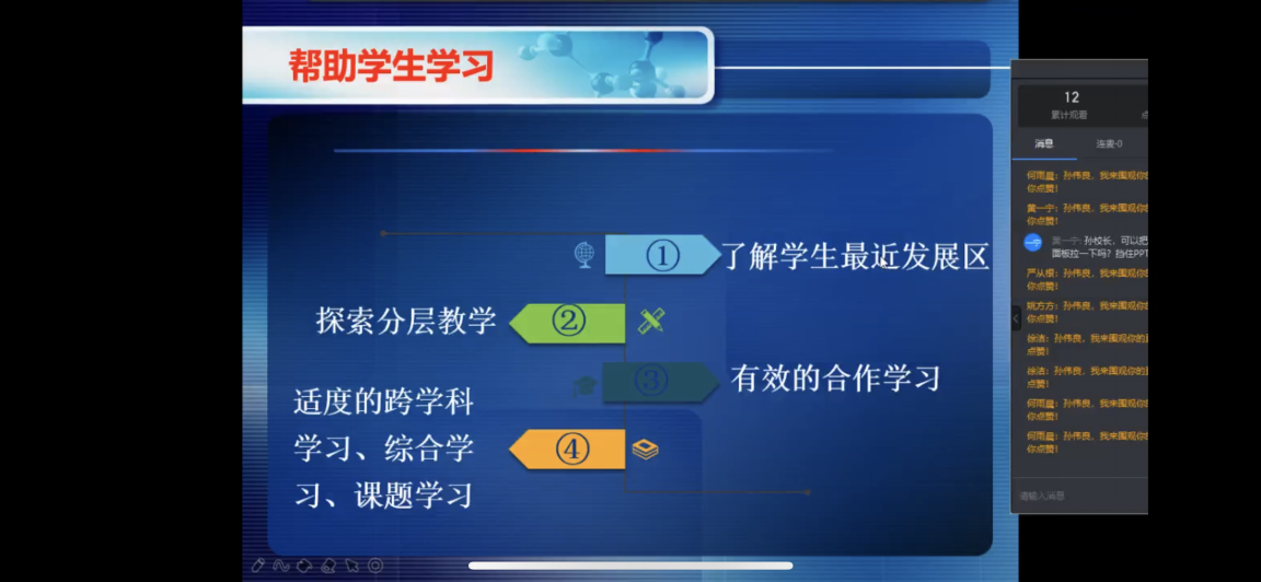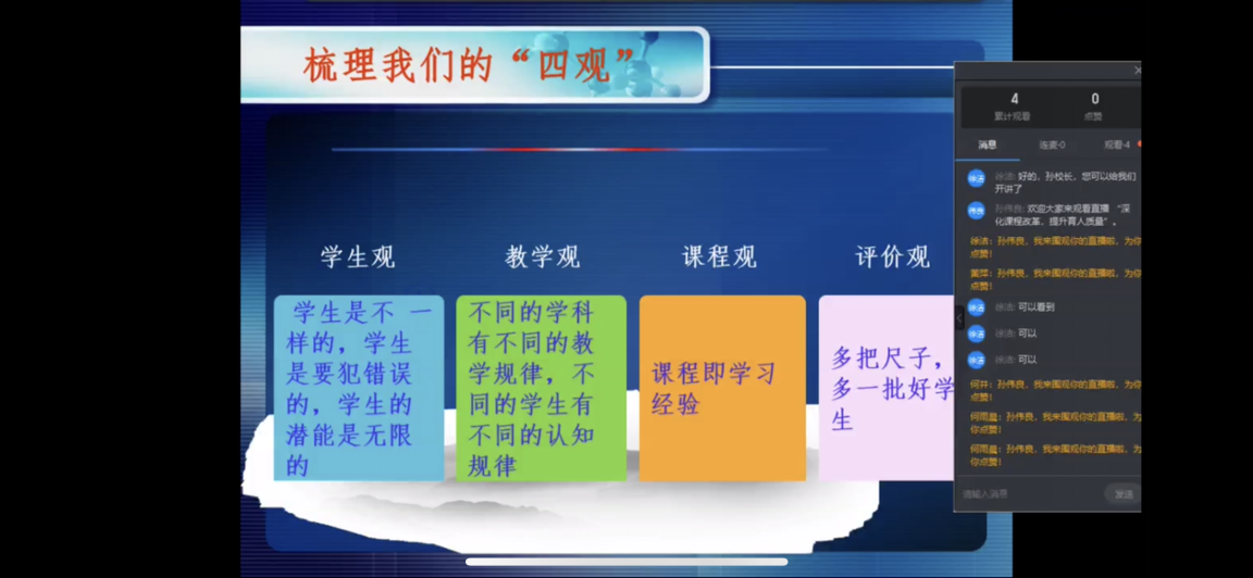 孙校长梳理了学生观、教学观、课程观、评价观,简单介绍了影响学生发展的四大因素和五大维度。结合在一线经验和生动的案例,阐述了在课程改革中应关注哪是个关键点,其中包括:关爱、激活、基础、钻研、针对性、学法、思维、自我评估、角色。