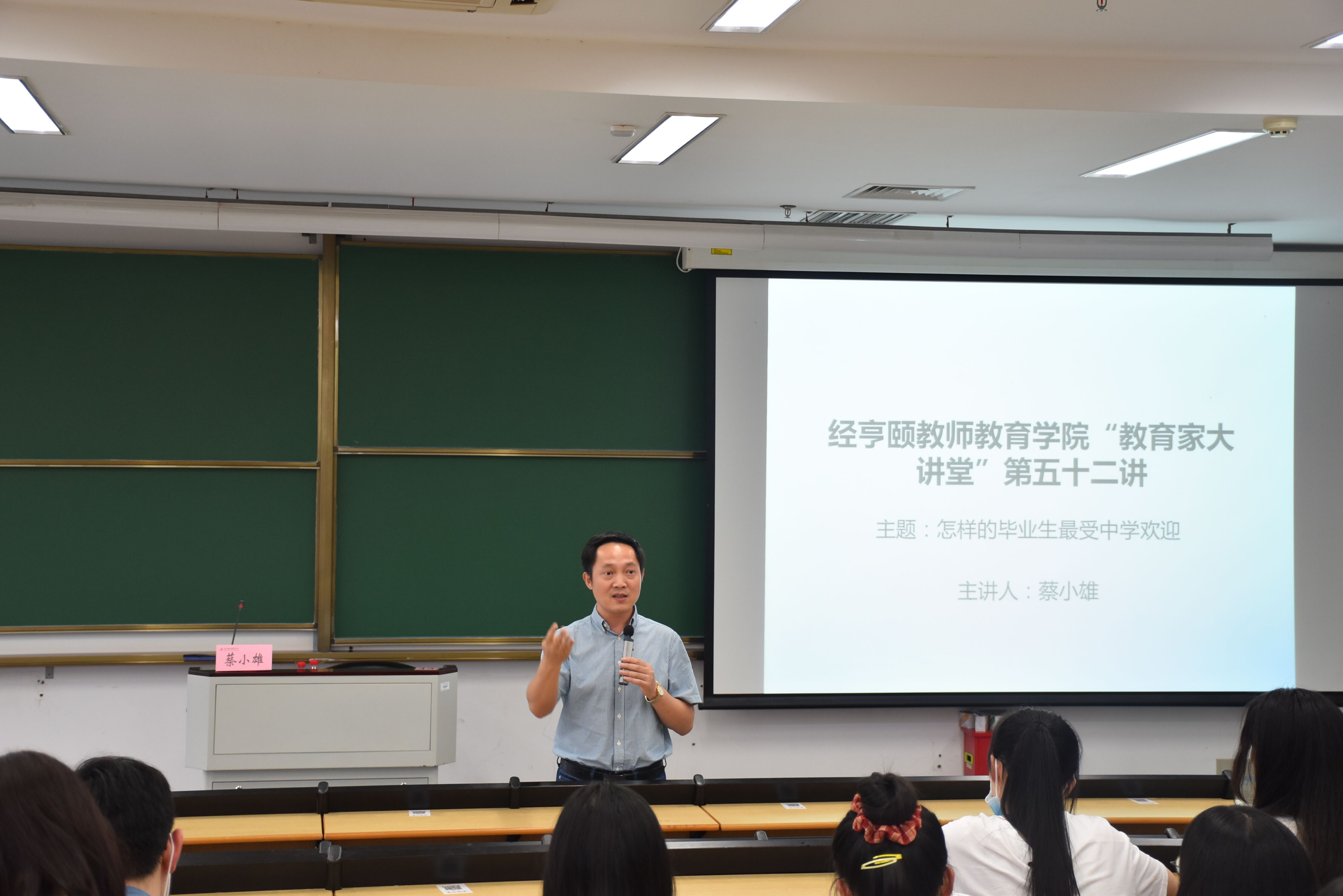 在中学的师资状况中,蔡校长用师范生与非师范生的比例、研究生以上学历的比例、重点高中教师男女性别比例三个数据,为同学们详细地分析了未来的中学教师招聘流程和就业形势,并以此为切入点向大家介绍了研究生与本科生、师范生与非师范生的相同点与区别,提出了对于本科期间应该做哪些相应准备的一些建议。