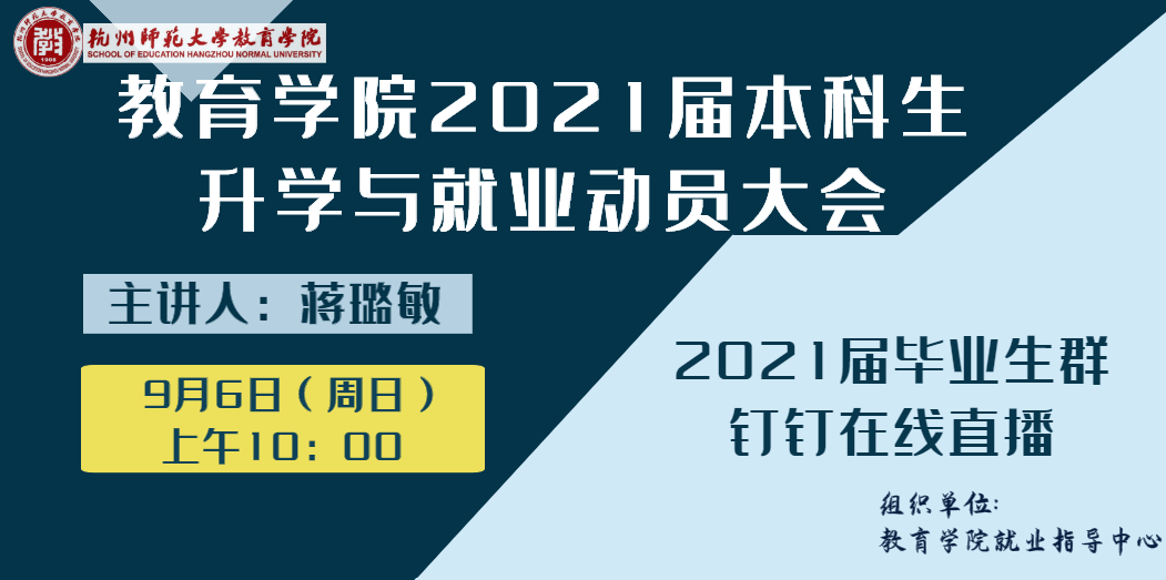 9月6日上午10点,教育学院2021届本科生升学与就业动员大会,在线上以钉钉直播的形式准时召开。本次大会围绕“升学与就业”展开。