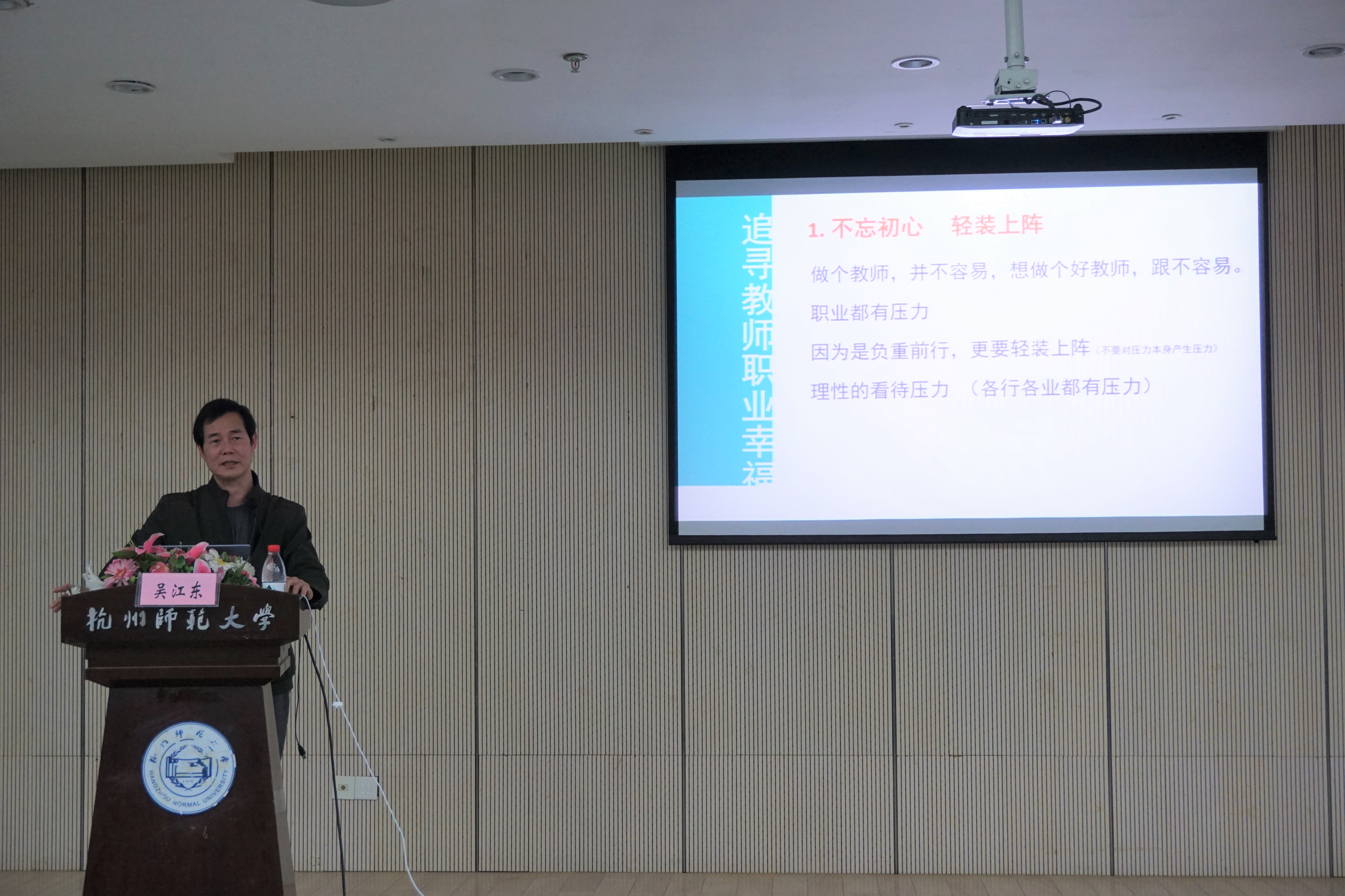 讲座上,吴老师以“不成敬意”四个字概括个人教育观念,以三十多年从教经历为基础,将其延伸为以下四点:不忘初心,轻装上阵;成就学生,发展自己;敬畏职业,拥抱团队;快意职场,珍惜当下。他与同学们分享了杭七中美术教育成果,指出教师的职业幸福是付出后的回报,不一定与物质完全割裂,只要能喊出属于自己的声音,活出属于自己的活法,走出属于自己的道路就是成功的人生。他还客观分析了当前“好岗位难找,好老师永远稀缺”的就业环境,鼓励在场的同学把握青春、积累经验、善于反思,将个人成长纳入自觉行为,做到认识自己、说服自己、投资自己,完成由新手到熟手再到专家的阶段跳跃。