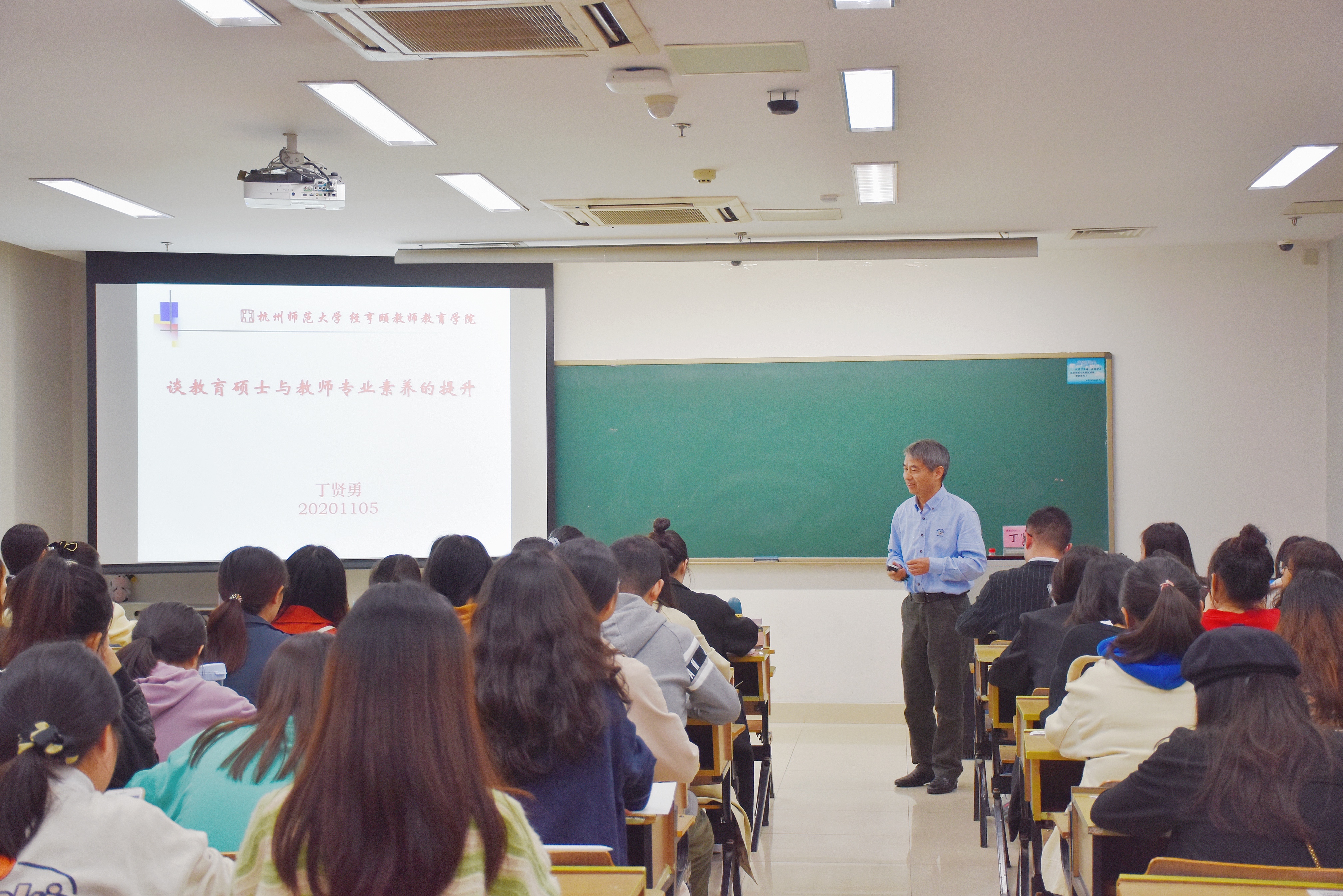 11月5日晚,经亨颐教师教育学院“子渊学术大讲堂”第一讲在恕园12号楼305教室举行。“全国优秀教师”、“全国教育硕士优秀指导教师”丁贤勇教授为桃花族论坛 全体研究生带来了“谈教育硕士与教师专业素养的提升”专题讲座。
