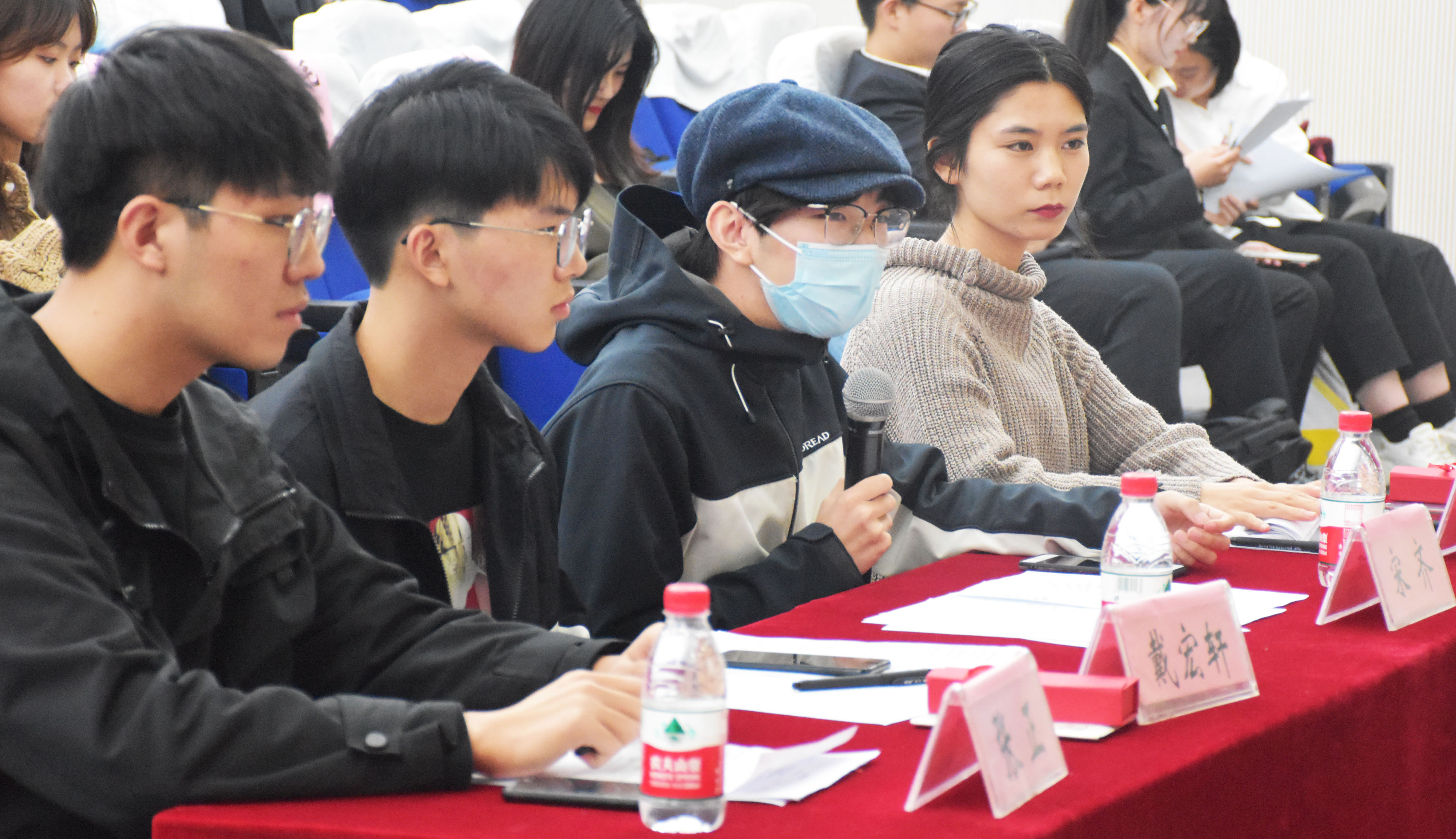 此次到场的评委有桃花族论坛 校辩论队队长张正、法学院辩论队队长宋齐、经管辩论队队长陈志珍,校辩论队资深辩手戴宏轩。出席的嘉宾有两院学生会主席以及学习部部长。两院同学代表也到场观看了这场别开生面的比赛。