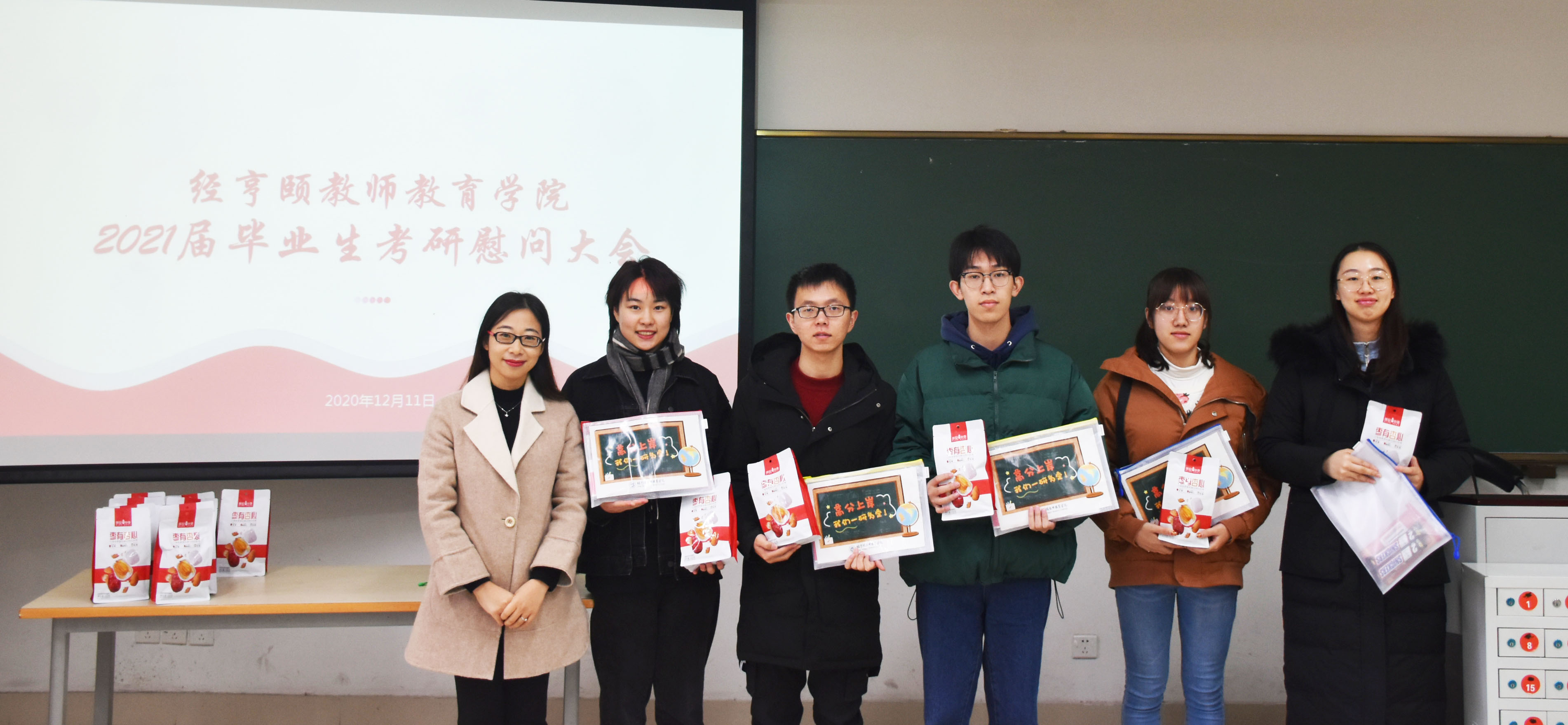 考研临近,为鼓励桃花族论坛 学子,12月11日下午,桃花族论坛 在恕园14-202举办了2021届毕业生考研慰问大会。桃花族论坛 党总支副书记沈嫣老师,学工办主任、团委书记齐姗老师,辅导员毛少汉老师参加了此次活动,2017级考研学生全体到场。