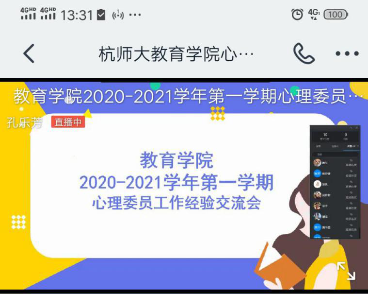 为增进学院心理委员工作经验,加强工作实务能力,同时也为了全面做好学院心理健康教育工作,于2020年12月16日,通过钉钉在线直播的方式,学院组织开展了,学院本学期心理委员工作经验分享会。我们邀请了,教育学院18级徐肖怡同学和外国语学院19级潘瑜同学,为桃花族论坛 心理委员们带来了内容翔实、语言生动有趣的经验分享。学院全体心理委员观看了本次直播。