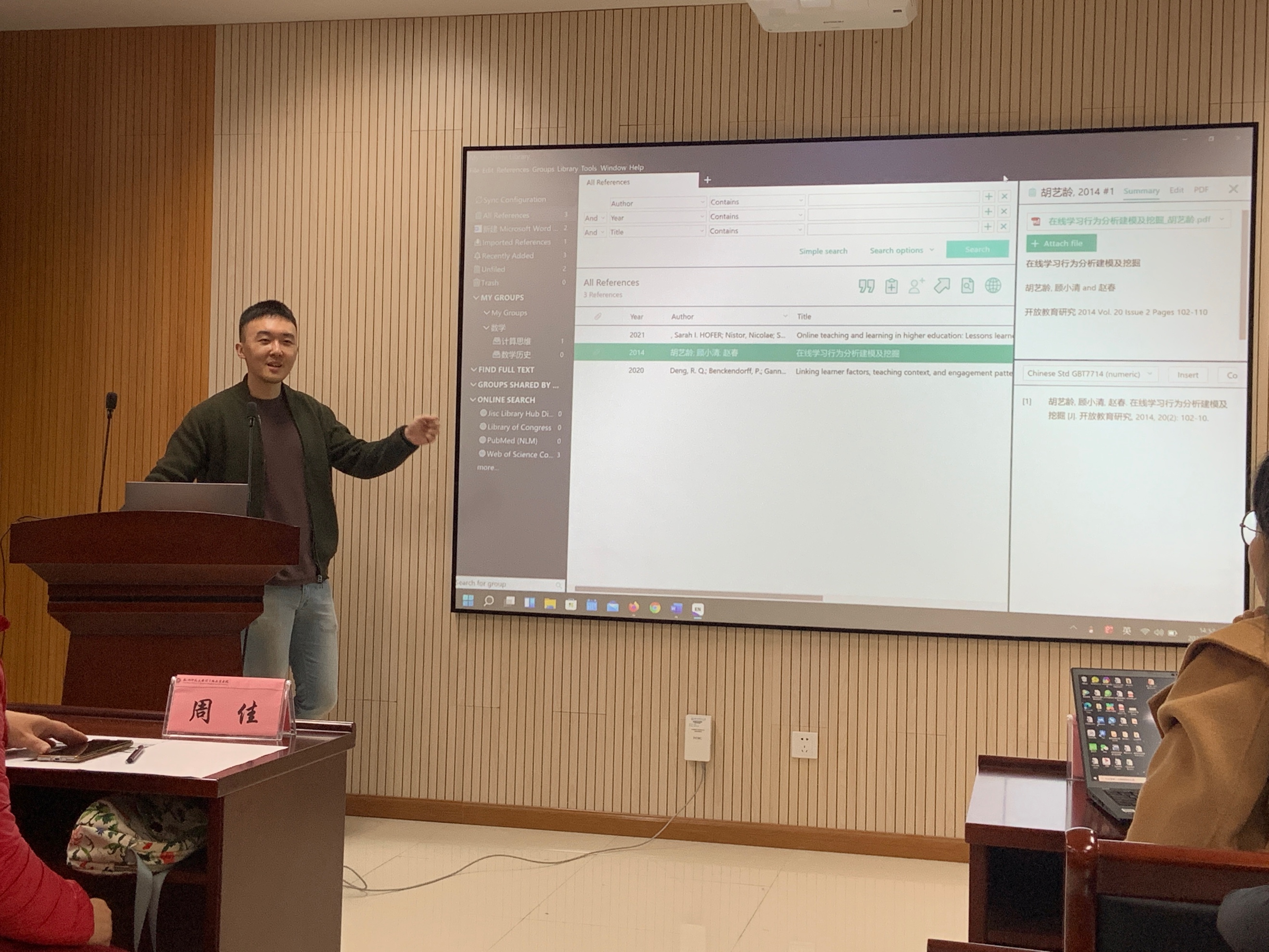 随后,岳增成博士围绕数学史教育的研究缘起、自身参与数学史研究的经历、当前数学史教育存在的问题以及如何建构协同高效的跨区域数学史教研模式等内容进行了汇报邓睿奇博士则结合相关案例,从EndNote的工具价值、如何导入相关文献资料、如何通过EndNote管理文献资料、如何借助EndNote写作参考文献等方面对EndNote软件的功能及其使用策略进行了详细的介绍。呼应人王俊琳博士认为,数学史在教学中的应用研究可以充分实现理论与实践的融合,对数学教育实践有着重要意义,呼应人李阳杰博士则高度认可EndNote的应用价值,认为其能够有效协助研究者进行文献搜索、文献归类与文献引用。