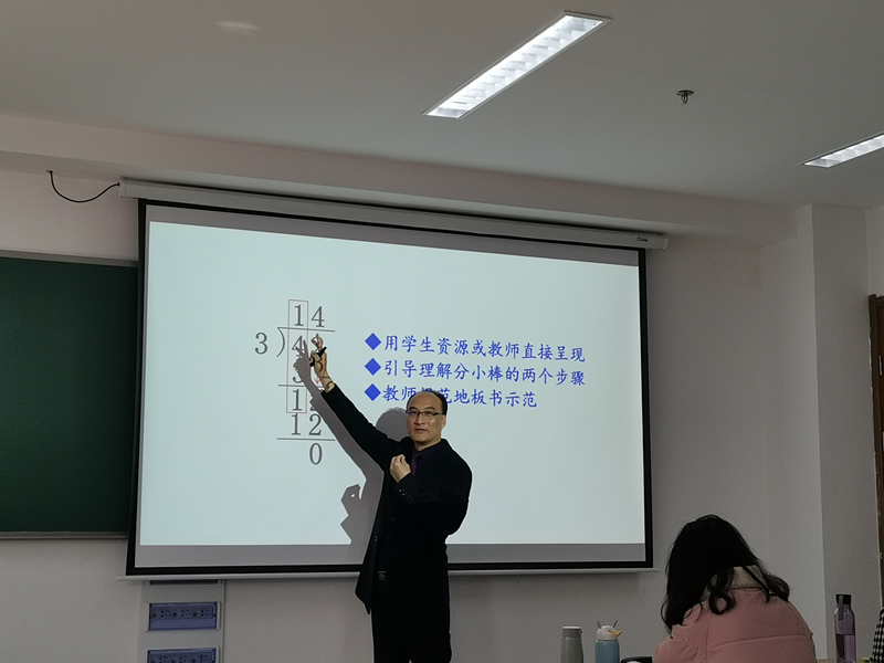 讲座伊始,顾老师首先强调了小学教师专业素质的重要性,他认为小学数学教学需要较强的教学艺术,要想方设法吸引学生的注意力,提高学生的学习兴趣。教学设计过程中,要创新教学环节、创新教法学法。顾老师还以具体的案例展示了创新课堂教学过程可带来的不同思考方式和教学效果。