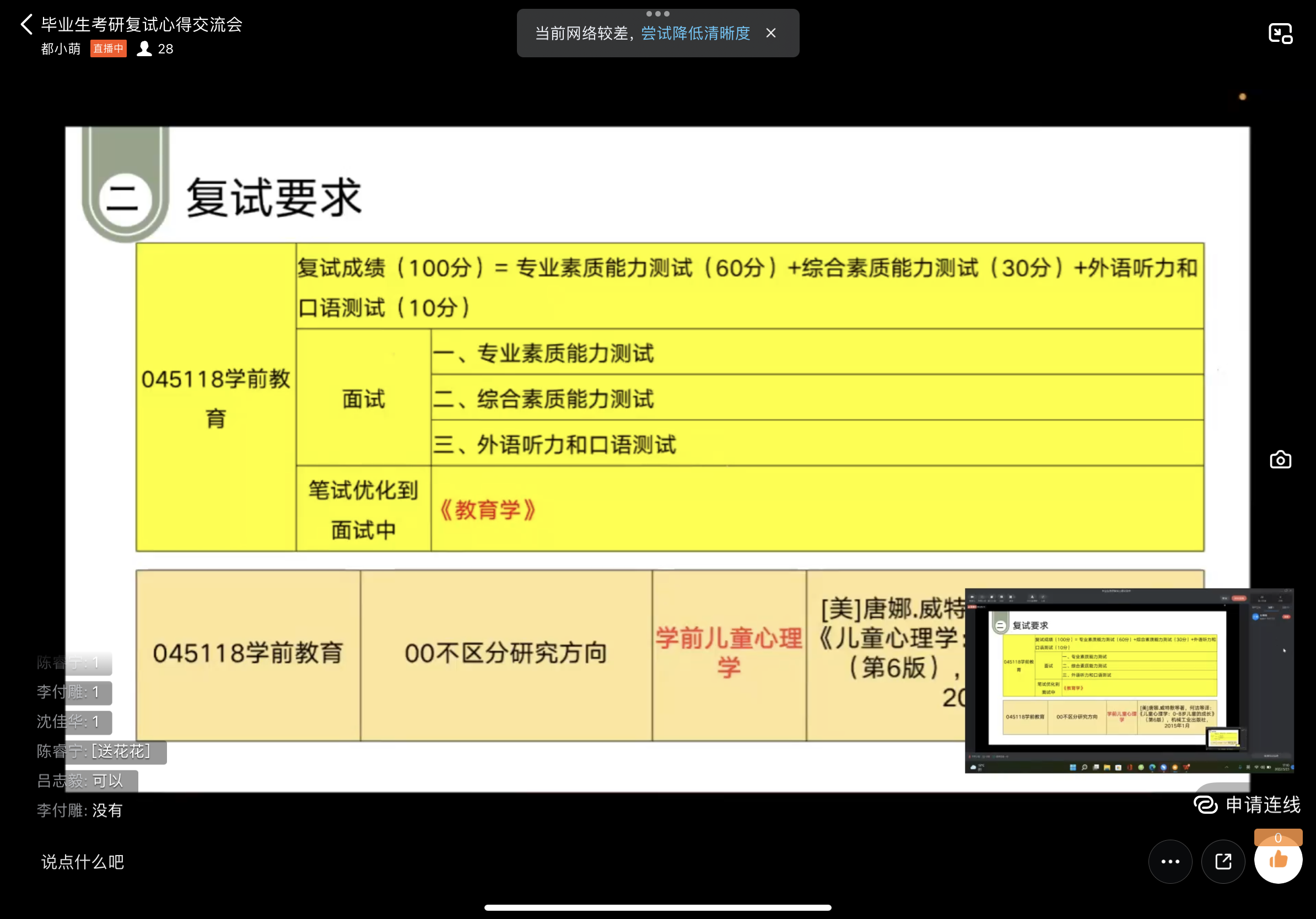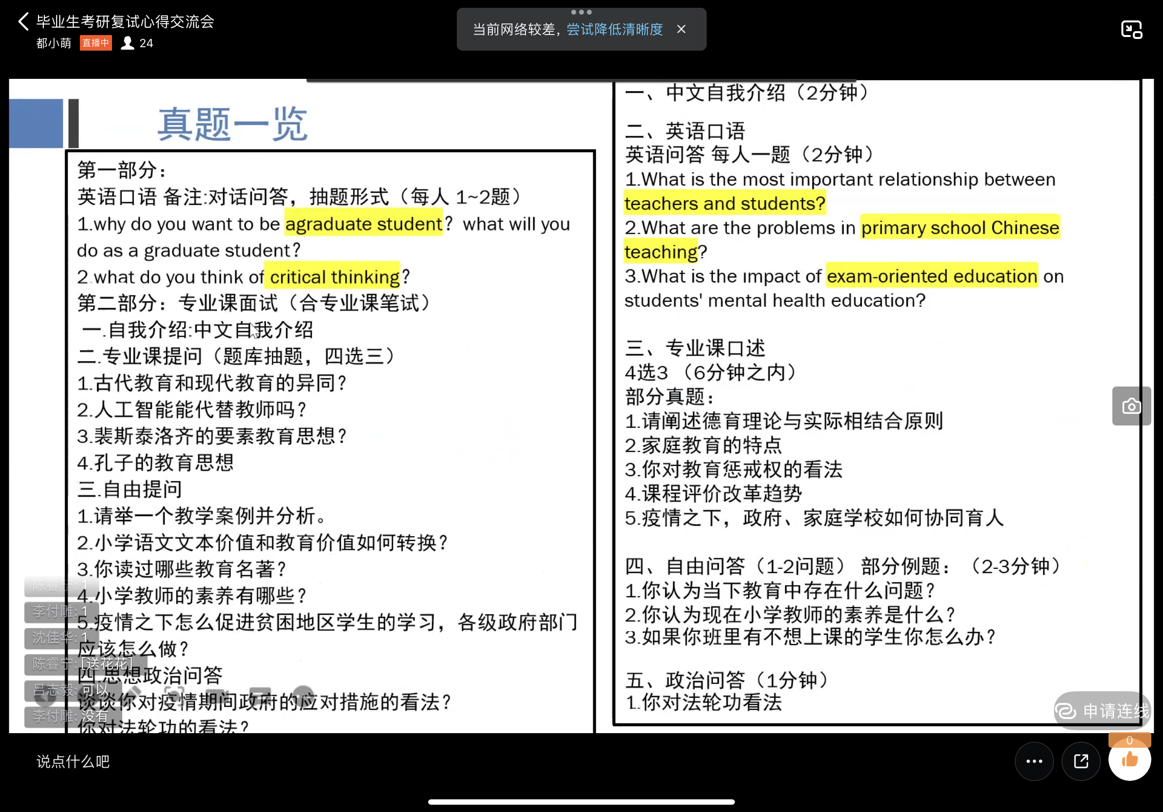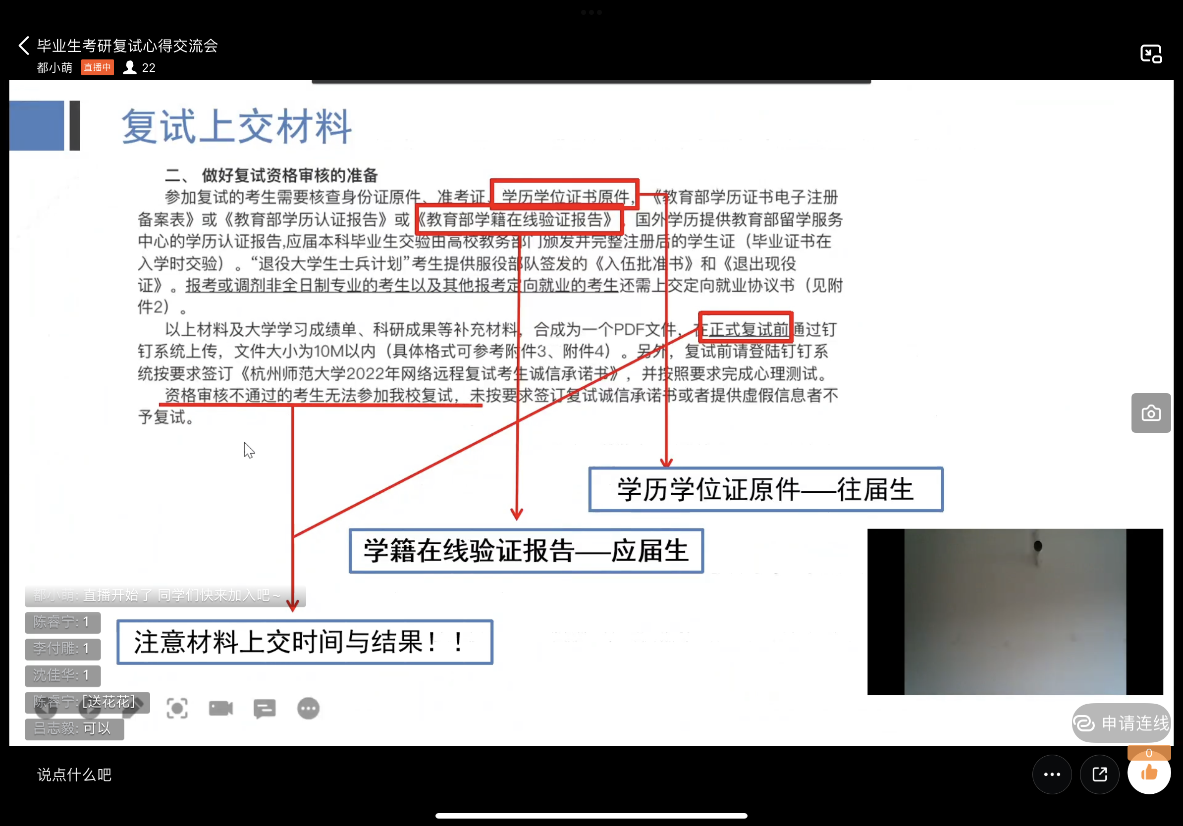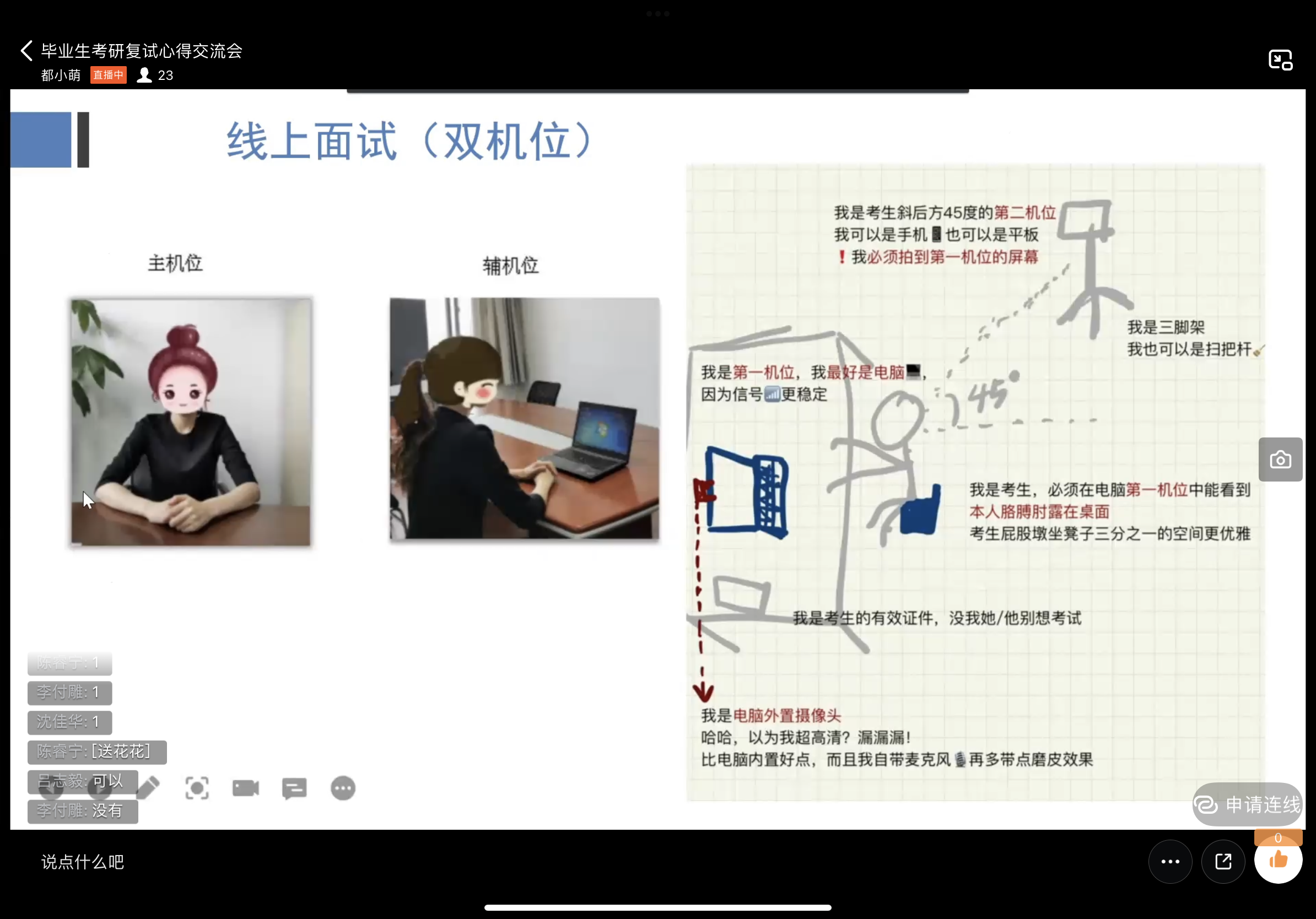 第一位是小学教育的研究生李昕宇学姐,学姐首先介绍了复试文件解读,接下来介绍了线上面试双机位的摆放方式和复试占比与时间分配。第二部分是复试流程,及自我介绍,专业课笔试,综合素质问答和政治立场考察,回答的技巧。
