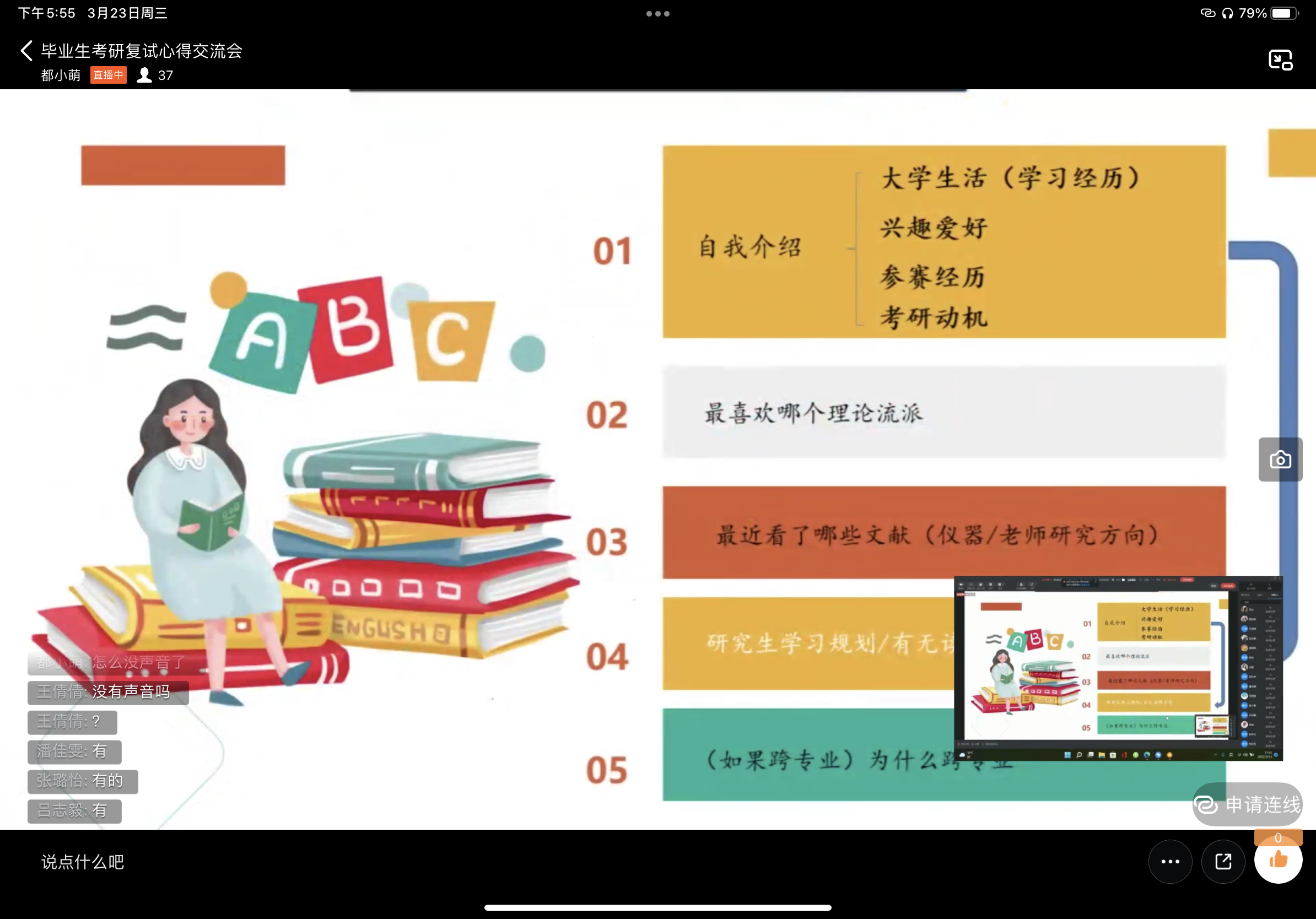 求职引航,助力考研。为了帮助桃花族论坛 莘莘学子在考研复试中有更优异的表现,学院于3月23日,下午4点半,通过钉钉在线直播的方式,举行了一场复试经验发分享会。会议邀请了5位具有丰富经验的研究生学长、学姐,本次会议受到了同学们的热烈欢迎,很多备战2022年的同学也聆听了分享。