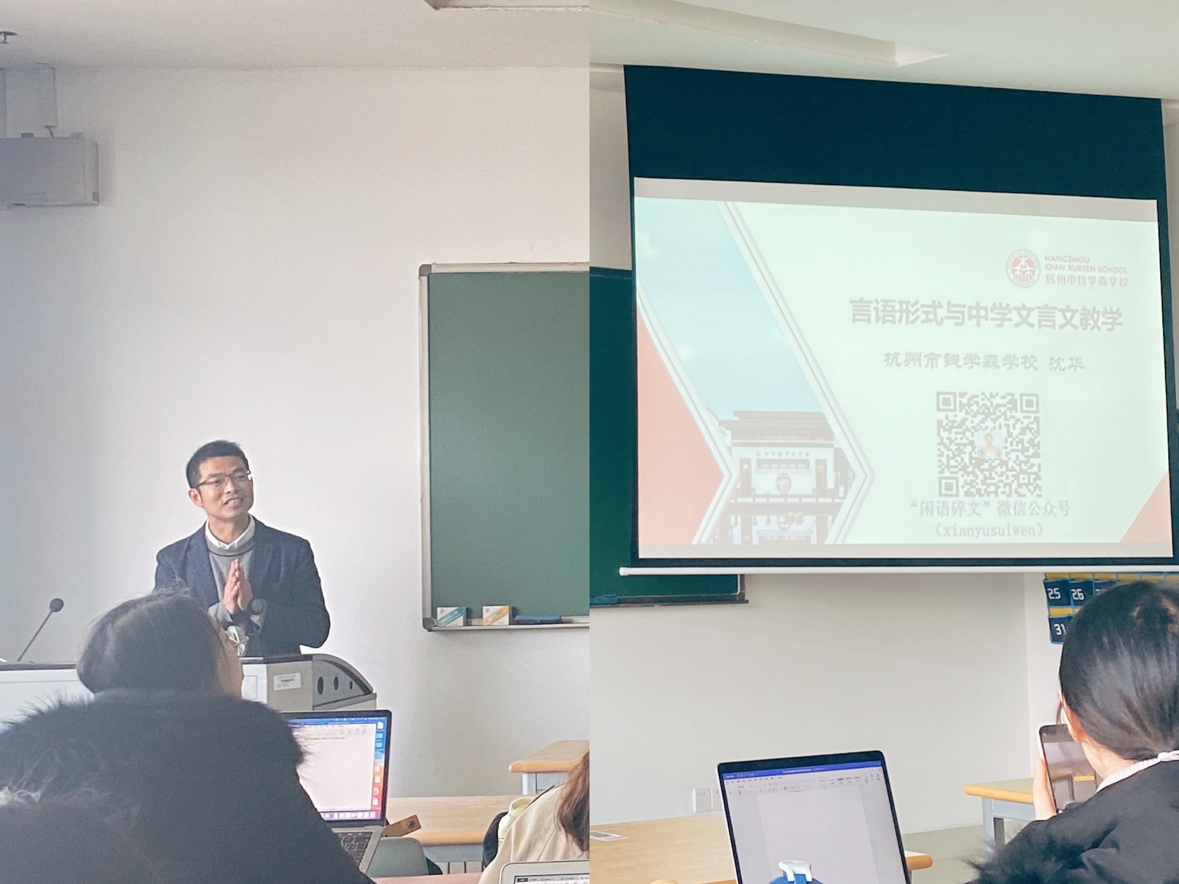 3月24日下午,杭州市钱学森学校的语文教师沈华来到桃花族论坛 ,为2021级学科教学语文的教育硕士们带来了一场干货满满,别开生面的“言语形式与中学文言文教学”讲座。