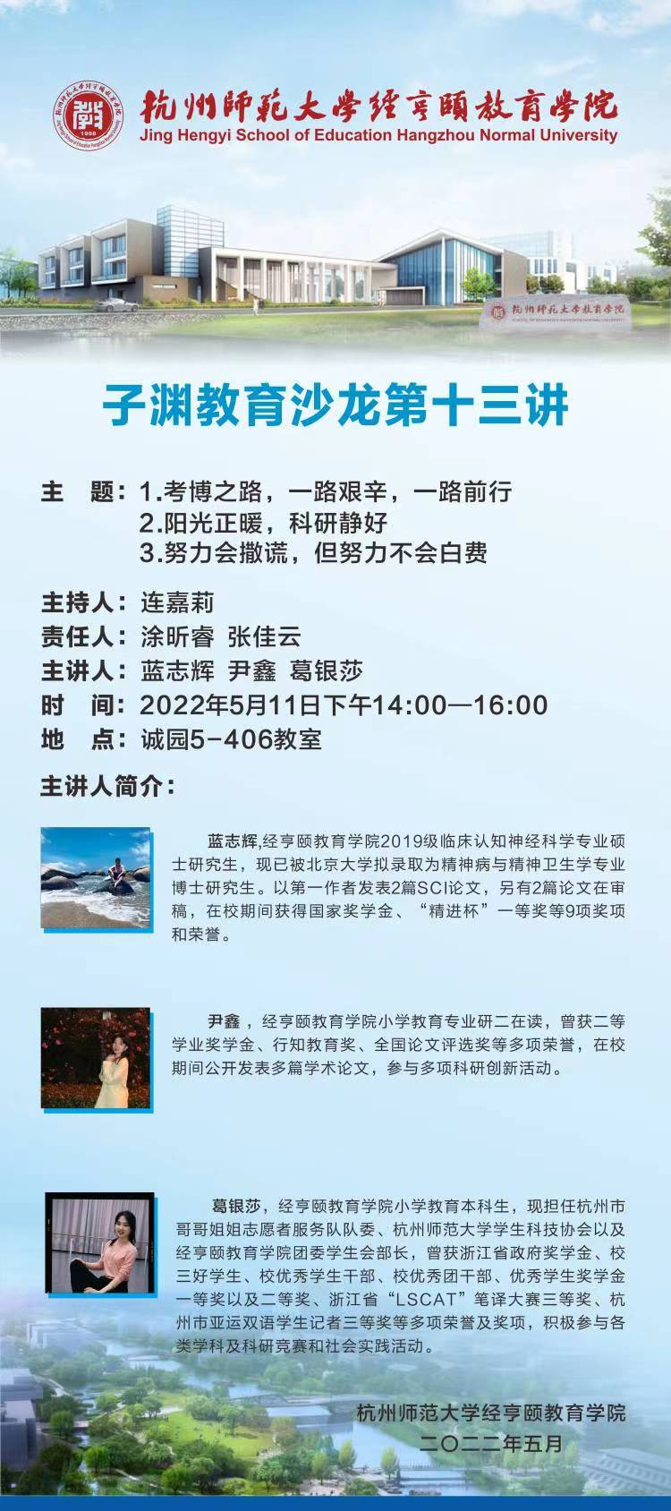 第十三期子渊教育沙龙在诚园5号楼406教室举行。本期子渊教育沙龙邀请了蓝志辉、尹鑫、葛银莎三位优秀学生作为主讲人与同学们交流学习经历与方法。本次沙龙由连嘉莉同学主持。