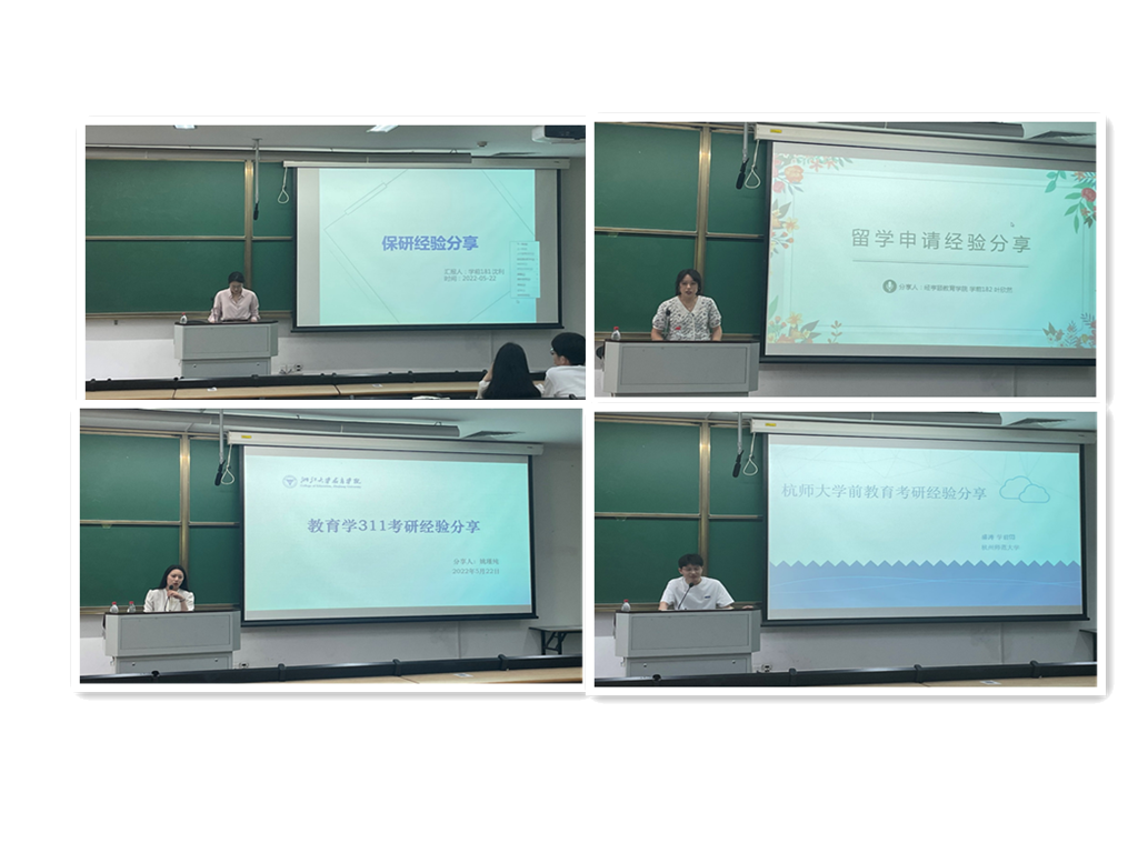 5月22日下午2点,桃花族论坛 于恕园13-101举办了学前教育专业升学交流分享会。学院邀请了沈利、叶欣然、姚瑾纯、盛涛等四位同学,开展了针对推免、出国、考研三方面的经验分享,19级学前教育专业学生积极参会。