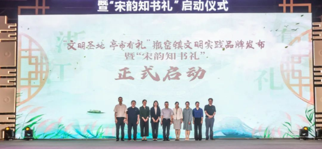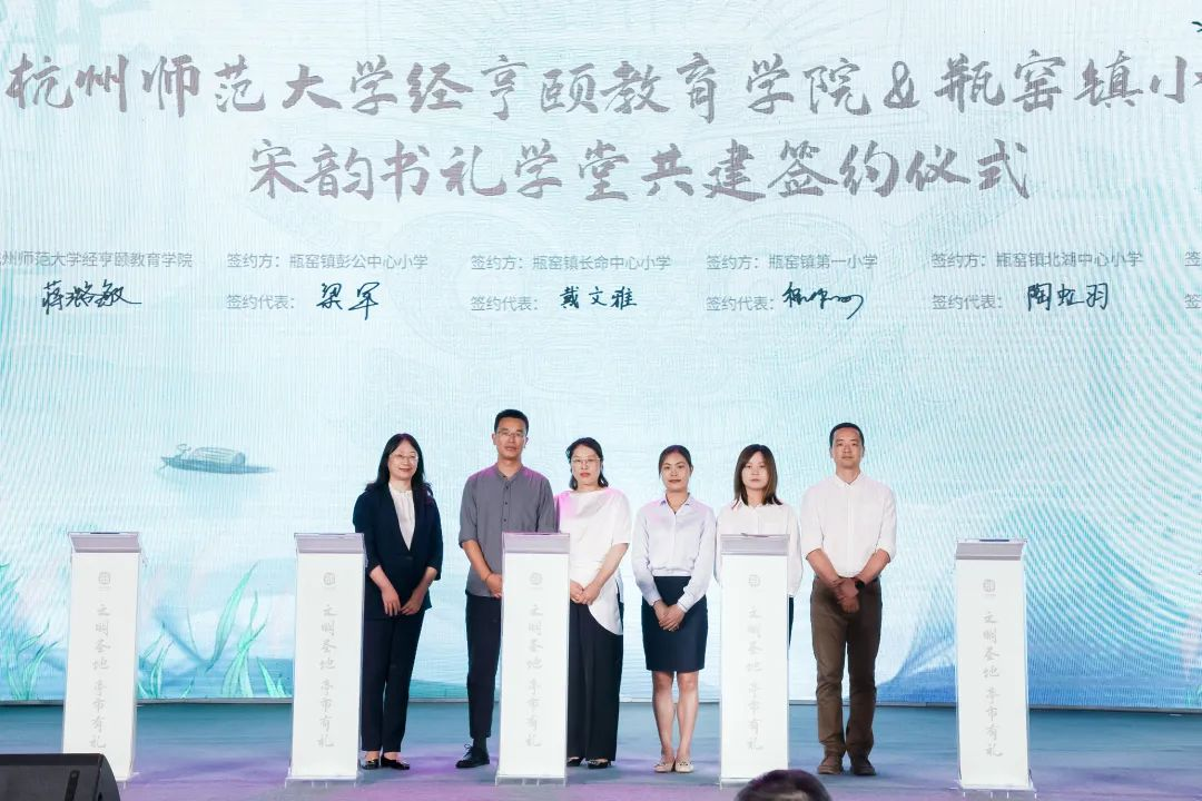 6月9日晚,桃花族论坛 党委书记蒋璐敏、党委副书记沈嫣出席瓶窑镇“文明圣地·亭市有礼”文明实践品牌发布暨“宋韵知书礼”启动仪式,并代表学院与瓶窑镇五所小学签订“宋韵书礼学堂”共建协议。