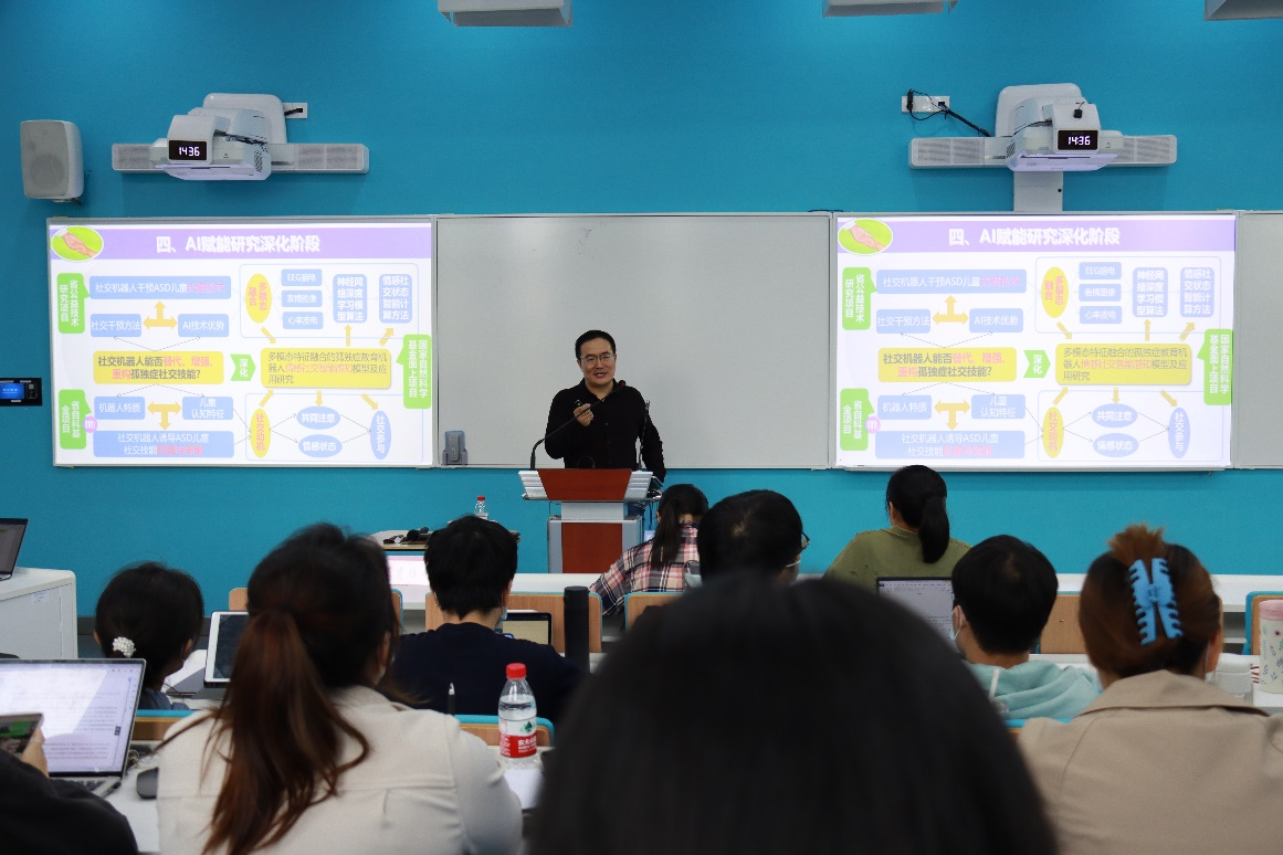 王永固教授本次讲座围绕研究背景、研究框架与范式、学科交叉探索阶段、AI赋能研究深化阶段和学科交叉融合阶段五方面展开。首先,王教授向我们介绍了人工智能赋能孤独症儿童康复教育的研究背景,即孤独症患病率越来越高和社会交往与沟通障碍。其次,针对研究框架与范式,王教授以孤独症儿童早期JESC社交障碍综合干预训练模式为框架,以孤独症儿童社交技能干预训练为研究范式,以学科交叉探索阶段、AI赋能研究深化阶段和学科交叉融合研究阶段为研究进展开展了相关研究。然后,王教授讲述了在学科交叉起始阶段,展开了哪些探索,以及如何展开探索。接着,王教授向大家讲述了AI赋能研究深化阶段,包括运用社交机器人诱导诱导ASD儿童社交技能机理与效能研究和深化后的多模态特征融合的孤独症教育机器人情感社交智能感知模型及应用研究。最后,王教授讲述了其团队目前的研究进度进入了学科交叉融合阶段,主要包括AI技术赋能的孤独症儿童社交技能干预方法、技术、辅具,并讲道做研究应当“上顶天、下立地”,借用习近平总书记的讲话,“应将研究做在中国大地上”。每一阶段,王教授都为大家介绍了其部分研究及成果,并向大家传授了摸现状—找机理—想对策的研究思路。