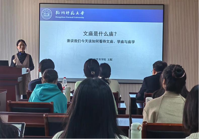 沙龙第一位主讲人是王配博士,她分享的主题是“文庙是什么庙?——兼谈我们今天该如何看待文庙、学庙与庙学”,包含四个部分的内容:什么是文庙、学庙与庙学;文庙、学庙与庙学的历史及现状;文庙、学庙与庙学的功能及作用;怎样认识与对待文庙、学庙与庙学。王老师指出,文庙是儒家文化遗产,是中华优秀传统文化的珍贵物质载体,也是我国教育的“活化石”。自两汉后,伴随统治者的尊孔崇儒,主祀孔子的庙宇与官学及宋元以后的部分书院渐渐融为一体,形成颇具特色的“庙学合一”现象,宋元之际多以“庙学”或“学庙”称之,明清以后多以“文庙”称之。至今中国及周边国家仍有大量的文庙遗存。在国家大力提倡传承和弘扬优秀传统文化的今天,我们如何认识、对待这些文化遗存,使其在新时代中国特色社会主义建设中继续发挥其应有的作用,这是摆在我们面前的一个重要课题。