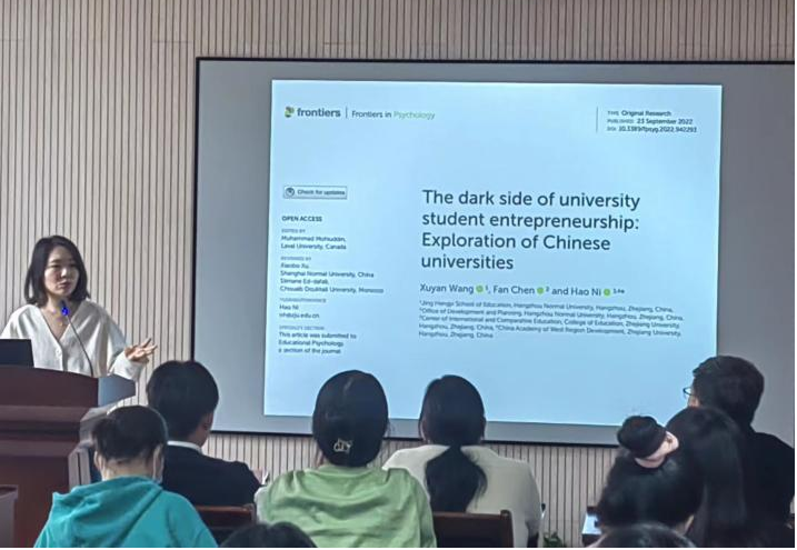 沙龙第二位主讲人是王旭燕博士。王老师主讲的题目是“学生创业的阴暗面:基于浙江省的实证研究”。首先,王老师指出,这是她最近在期刊《Frontiers in Psychology》上发表的一项题名为《The dark side of university student entrepreneurship: Exploration of Chinese universities》的研究。接着,王老师从研究缘起、研究方法和路径选择、研究抽样标准、中国创业教育的背景、研究结果和讨论等方面对研究内容进行了分享,并基于论文内容分享了一些英文论文发表的经验和质性研究的研究设计和研究方法。王老师指出,目前创业教育研究经历了从比较向实证方向的转向,研究从批判的视角出发探讨了中国学生创业的阴暗面,遵循后实证主义研究范式下实践的认知旨趣和解放的认知旨趣,关注学生个体内心经验和内在意义探求,力求揭示中国创业教育实践中存在的问题,研究为中国创业教育中的问题从阴暗面转向光明面提供了实证证据。