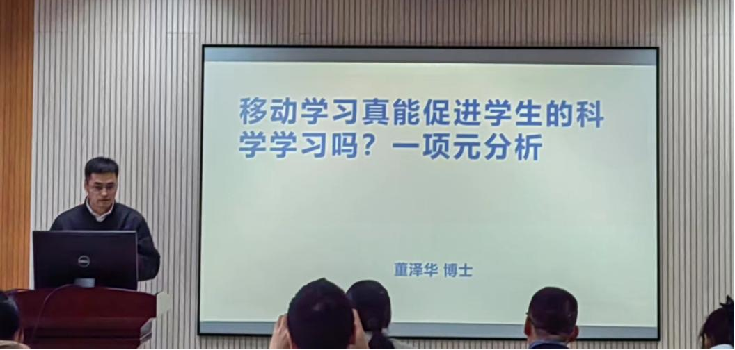 沙龙第二位主讲人是董泽华博士,他分享的主题是“移动学习真能促进学生的科学学习吗?一项元分析”。董老师首先介绍了本项研究的研究问题及研究假设。指出移动学习对学生科学学业成就产生了不同大小的效应值,并基于文献理论提出了学习方式、文化、使用者角色、学科内容等都可能影响效应值的大小。接着,董老师基于元分析方法呈现了研究结果,并对结果进行一一阐释和分析。最后,董老师就研究结论进行了讨论,并针对研究的局限性提出未来的研究方向。