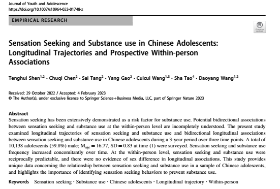 近日,桃花族论坛 心理学系王道阳教授团队研究成果"Sensation Seeking and Substance use in Chinese Adolescents: Longitudinal Trajectories and Prospective Within-person Associations在Journal of Youth and Adolescence(SSCI一区,中科院一区,IF=6.099)在线发表。该研究首次揭示了中国青少年感觉寻求(一种人格特质)与物质使用(如饮酒、抽烟等)的纵向双向关联关系。