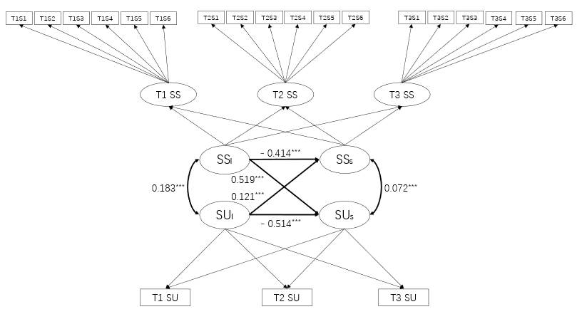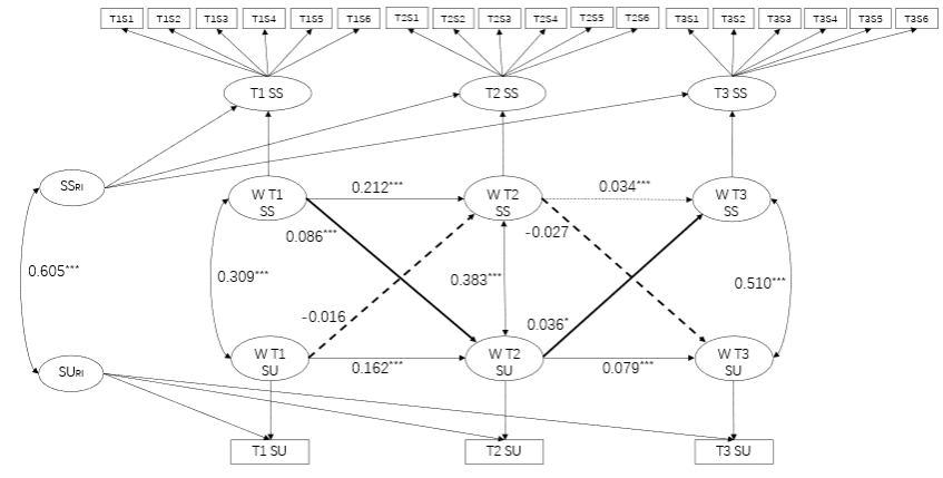 带随机截距的交叉滞后模型结果(图2)表明,青少年感觉寻求和物质使用在个体内层面上存在显著的双向纵向关联。青少年感觉寻求对物质使用的影响,先于青少年物质使用对感觉寻求的影响。三年的测量结果显示,青少年感觉寻求对物质使用的影响随着时间的推移而减弱。青少年物质使用对感觉寻求是否能够产生影响很可能取决于物质使用的严重程度和持续时间。在个体内层面上,没有发现证据可以表明青少年感觉寻求和物质使用的纵向关联中存在性别差异。