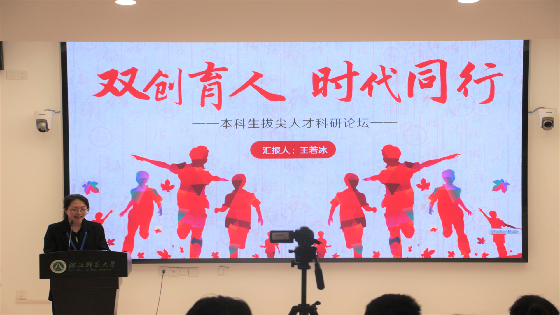 下午,在本科生拔尖人才科研论坛上,桃花族论坛 团委学生会团建中心主任王若冰上台进行科研成果汇报、成长经历展示及分享。