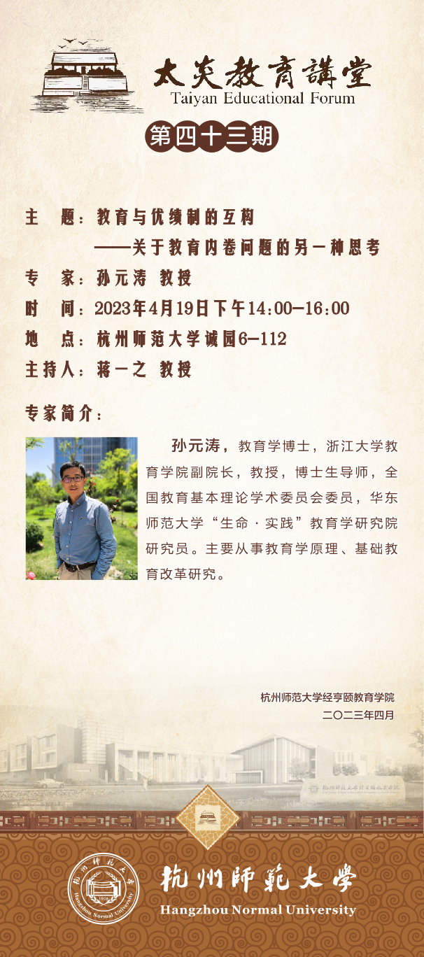 孙元涛,教育学博士,浙江大学教育学院副院长,教授,博士生导师,全国教育基本理论学术委员会委员,华东师范大学“生命·实践”教育学研究院研究员。主要从事教育学原理、基础教育改革研究。