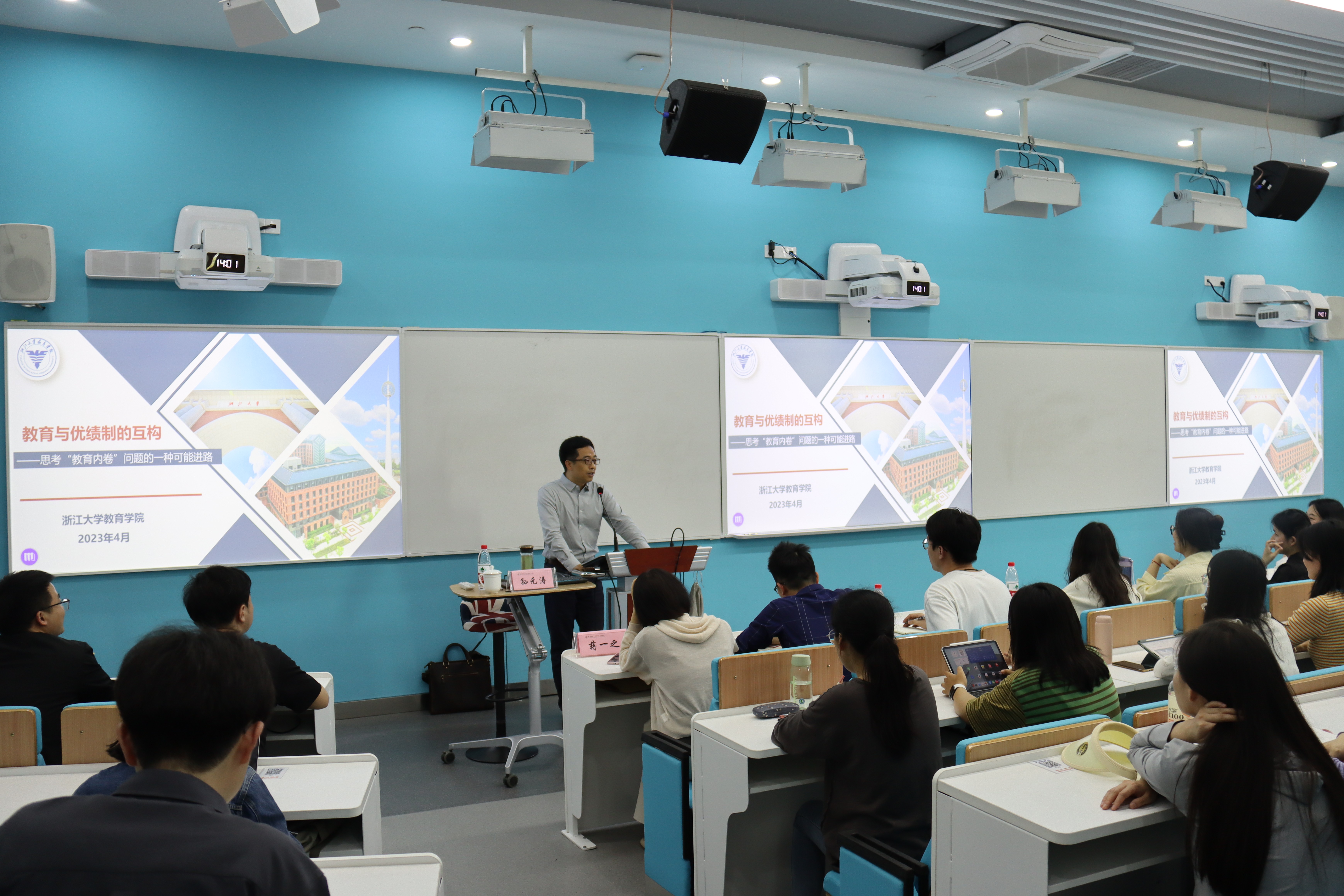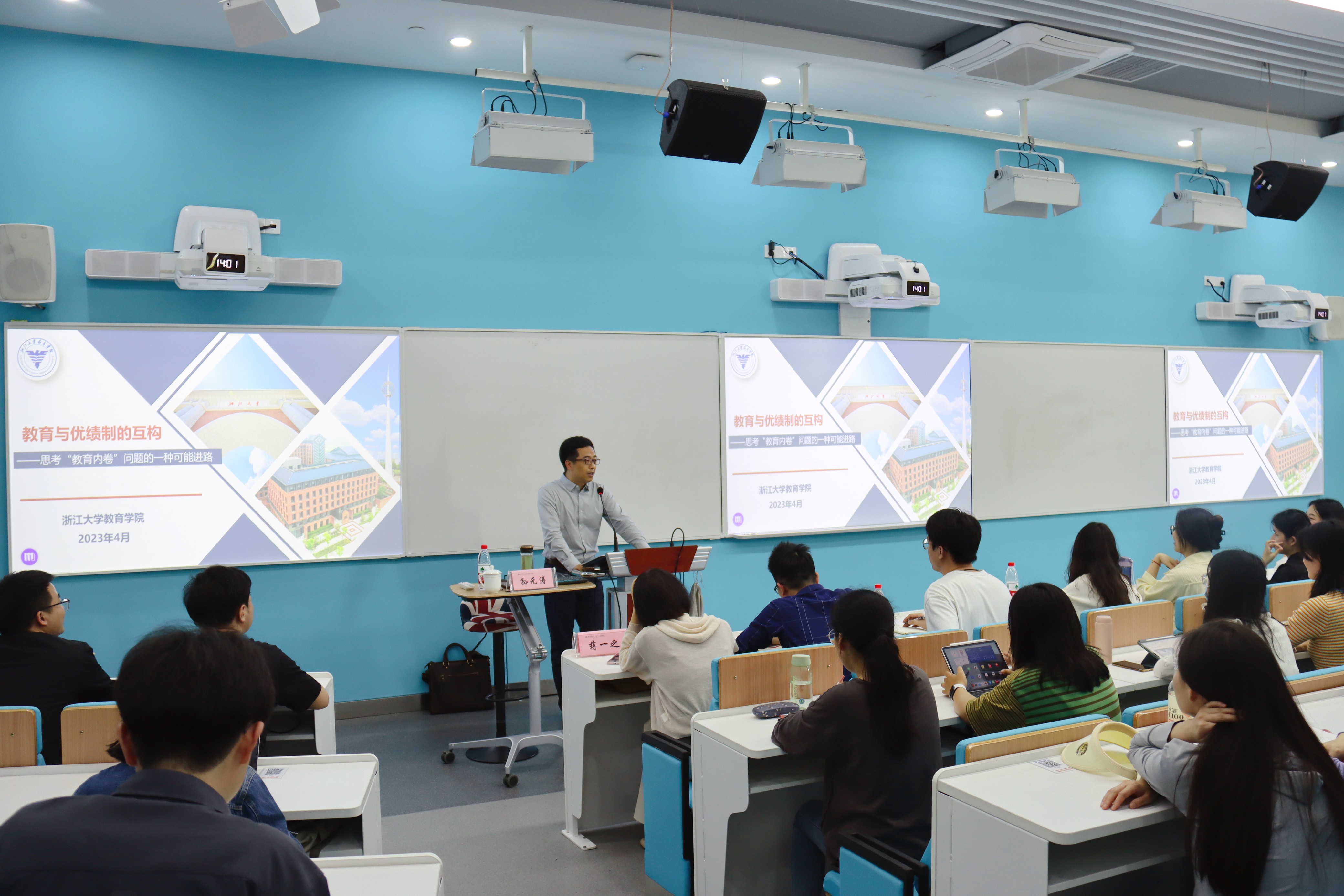 2023年4月9日下午,浙江大学教育学院副院长孙元涛教授做客第四十三期太炎教育讲堂,为桃花族论坛 师生做题为“教育与优绩制的互构——关于教育内卷问题的另一种思考”的学术讲座。讲座由蒋一之教授主持,学院100余名师生参与了本次讲座。