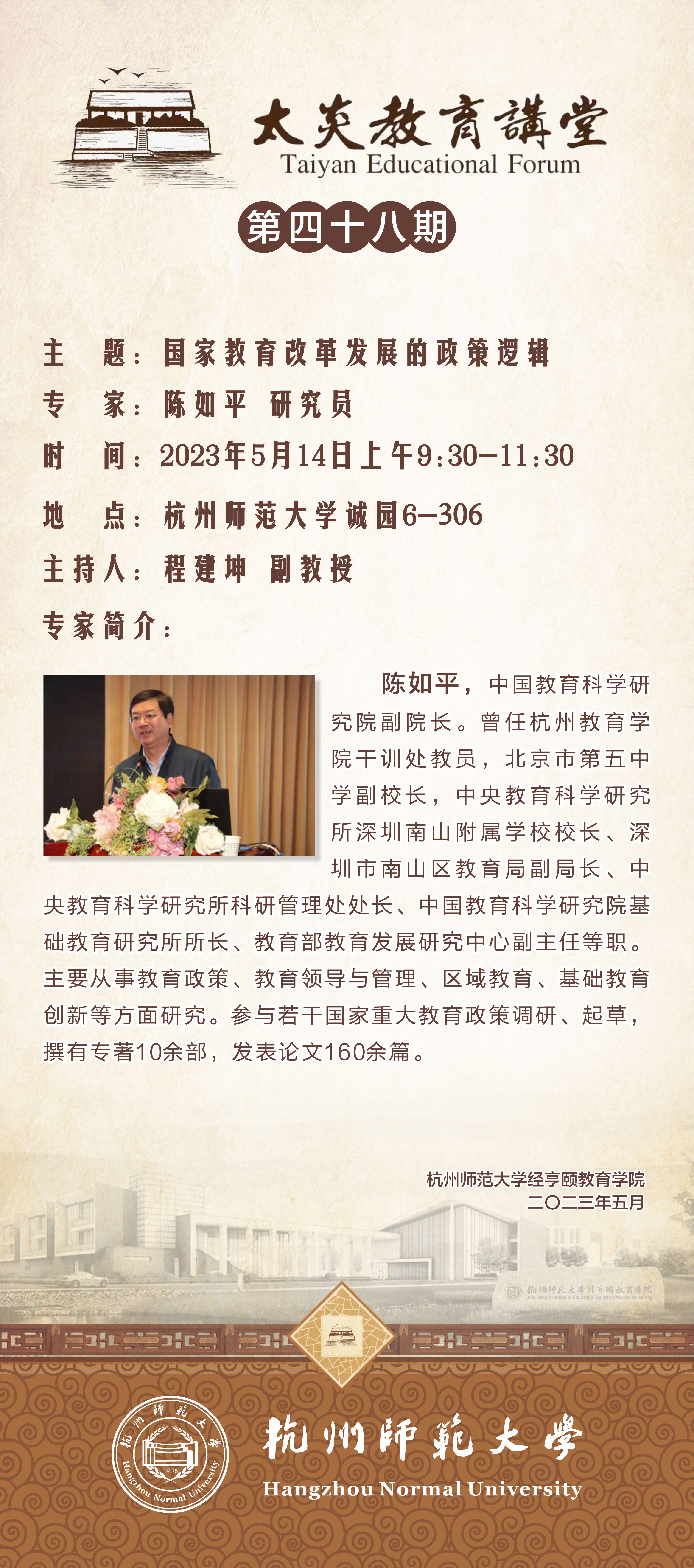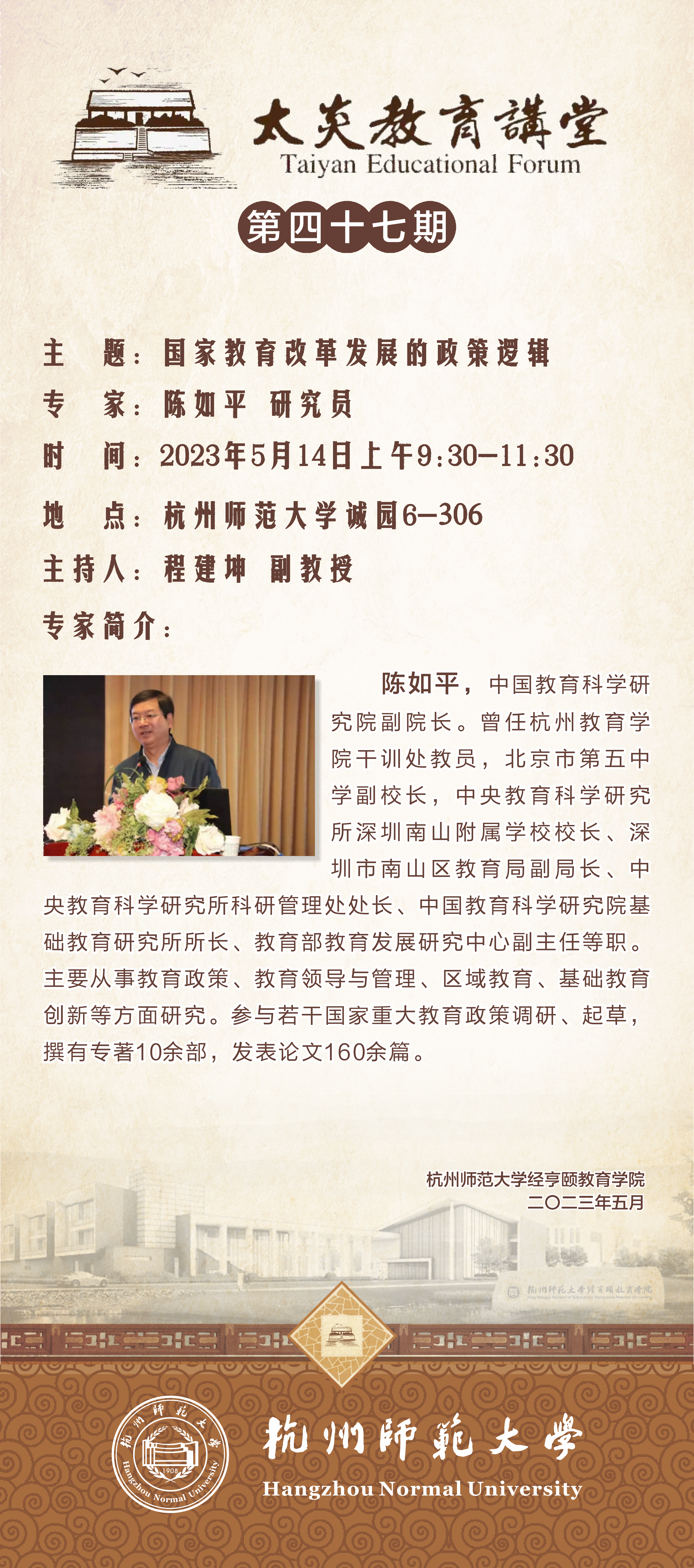 陈如平,中国教育科学研究院副院长。曾任杭州教育学院干训处教员,北京市第五中学副校长,中央教育科学研究所深圳南山附属学校校长、深圳市南山区教育局副局长、中央教育科学研究所科研管理处处长、中国教育科学研究院基础教育研究所所长、教育部教育发展研究中心副主任等职。主要从事教育政策、教育领导与管理、区域教育、基础教育创新等方面研究。参与若干国家重大教育政策调研、起草,撰有专著10余部,发表论文160余篇。