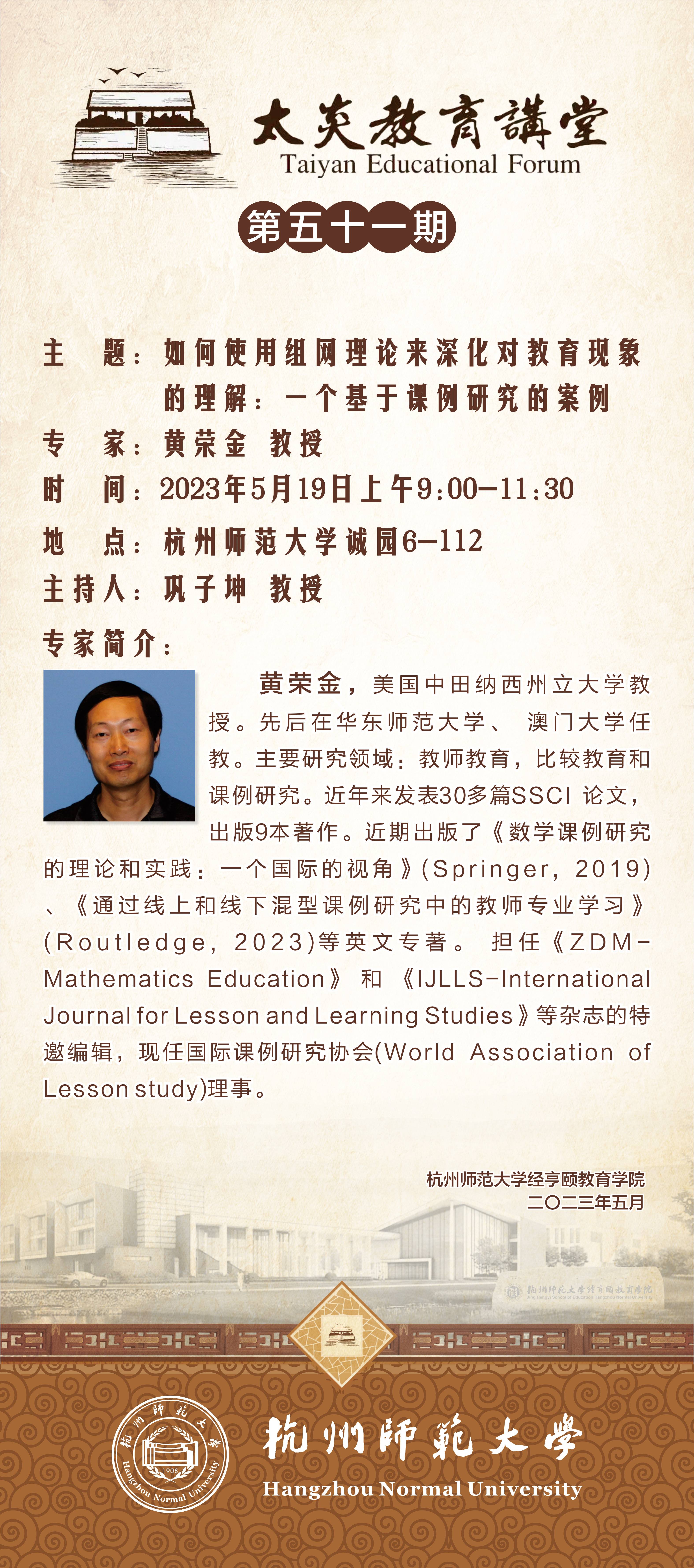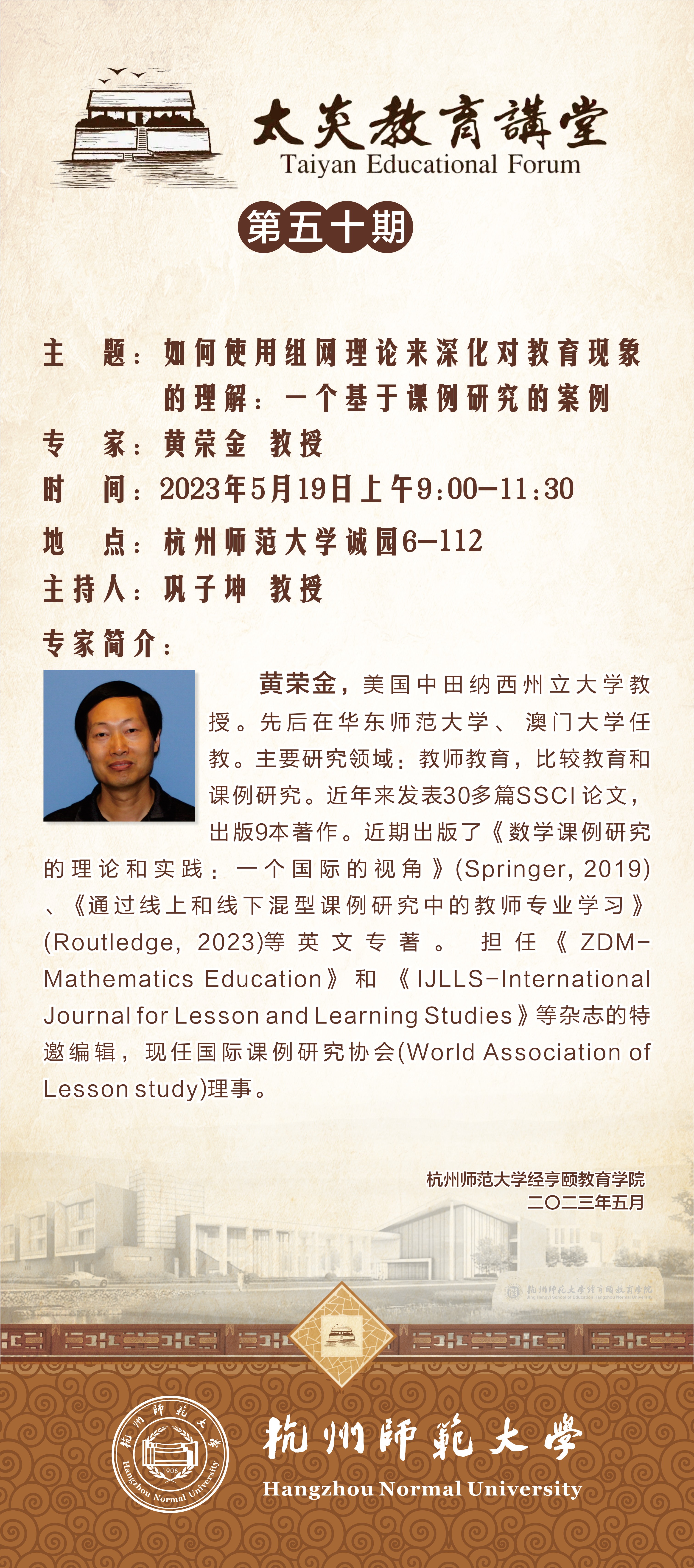 黄荣金,美国中田纳西州立大学教授。先后在华东师范大学、 澳门大学任教。主要研究领域:教师教育,比较教育和课例研究。近年来发表30多篇SSCI 论文,出版9本著作。近期出版了《数学课例研究的理论和实践:一个国际的视角》(Springer, 2019) 、《通过线上和线下混型课例研究中的教师专业学习》(Routledge, 2023)等英文专著。 担任《ZDM- Mathematics Education》 和 《IJLLS-International Journal for Lesson and Learning Studies》等杂志的特邀编辑,现任国际课例研究协会(World Association of Lesson study)理事。