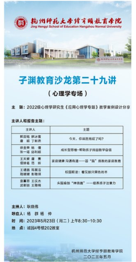 5月23日,第二十九期子渊教育沙龙在诚园4号楼202教室顺利举行。本期教育沙龙邀请了郭蕊铭、徐金荣、王天爱、王靖茜、袁蔓思等共二十位2022级心理学研究生作为主讲人与同学们交流互动,本次沙龙的主题为“应用心理学专题教学案例设计分享”,本次沙龙的主持人为耿晓伟。