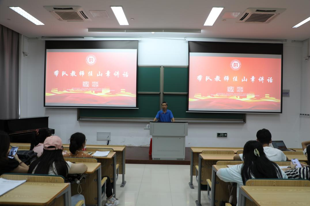 带队教师任山章老师首先发表讲话。他提出实习是专业硕士学习阶段的重要环节,鼓励同学们要抓住机会,在实习学校多参加研习活动。因此,他向同学们提出了四点建议:首先目标必须明确,自身要注意培养方向和就业方向;其次心态要平和,以乐观的态度对待实习;再次要学会相互尊重,尊重实习的学校和教师;最后要学会平衡,平衡实习和学业的关系,平衡教学和科研之间的关系。