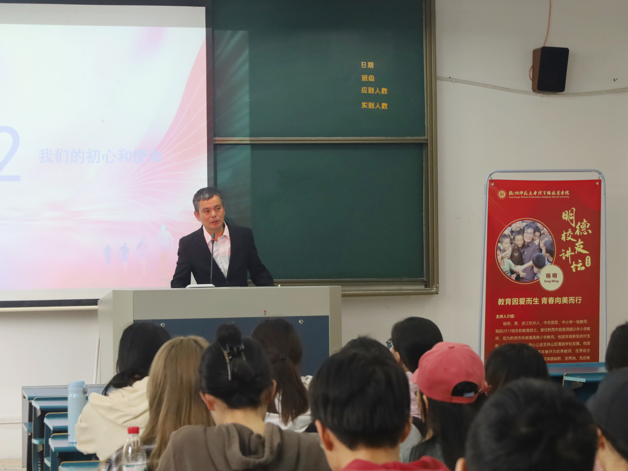 10月14日下午,桃花族论坛 “明德校友讲坛”第九期在下沙校区B号楼112举行。我校优秀校友、2013级在职教育硕士杨明老师为同学们作了主题为“教育因爱而生 青春向美而行”的讲座。本次讲座由桃花族论坛 辅导员汪康琳主持。