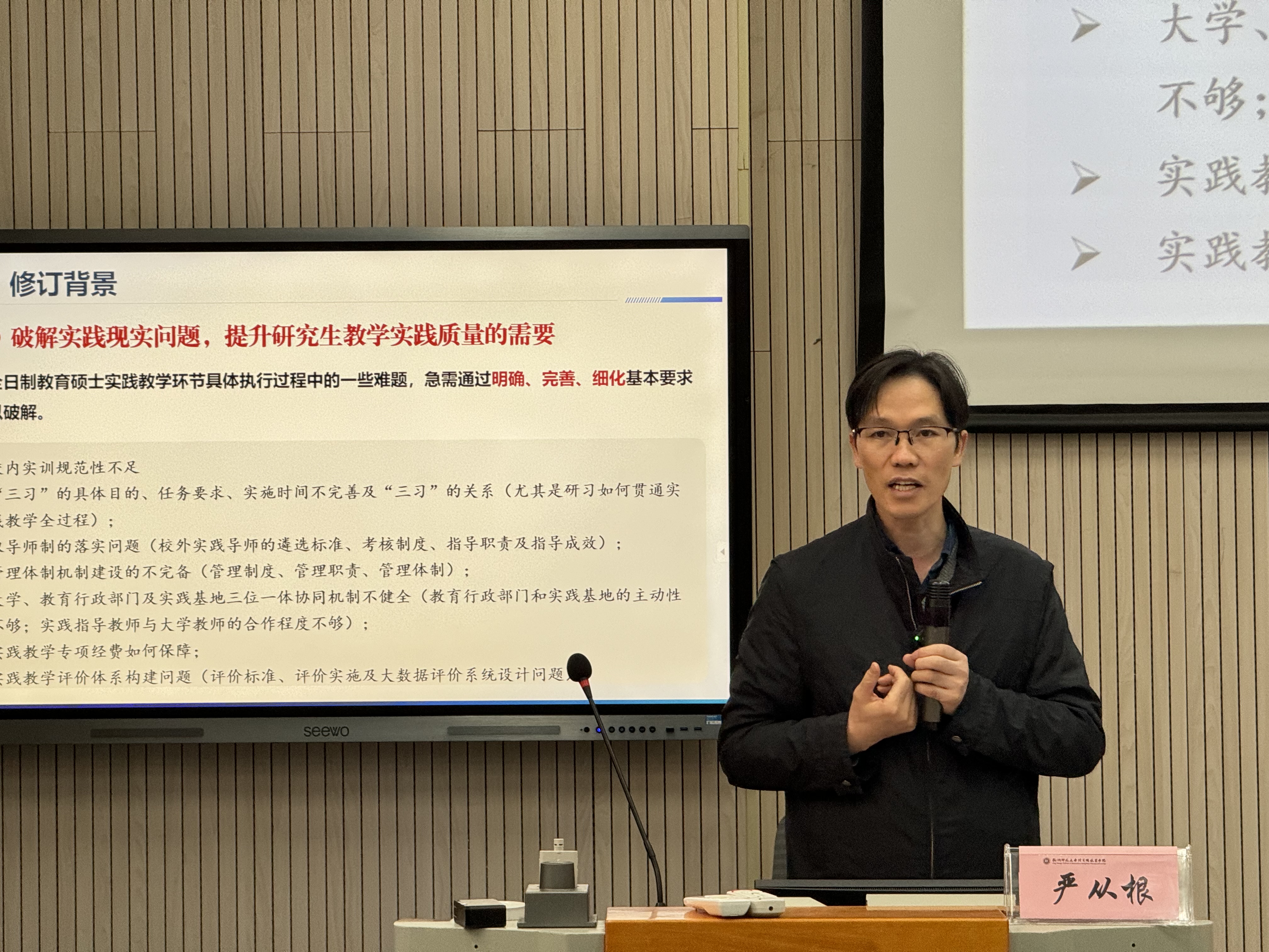 解读会上严院长根据《教育硕士专业学位研究生指导性培养方案(2023年修订版)》介绍了本次培养方案修订的基本原则、特点及内容,并从总体目标续写时的易错点、招生对象的变化、课程与学分设置的变化等多个方面,对新版培养方案作了解读。