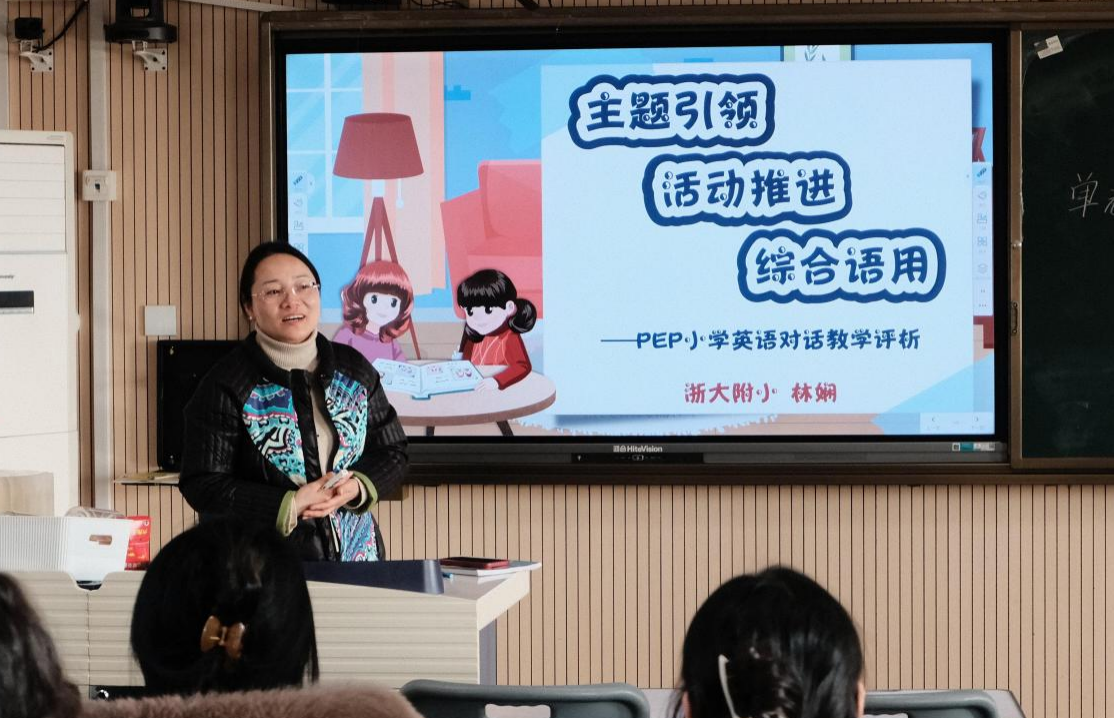 听课结束后,杭州市求是教育集团林娴老师带来了《主题引领,活动推进,综合语用》与《基于思维品质培养的小学英语阅读教学思考》两个维度的教学讲座。启示教师应先以主题为引领,整合语言知识;再以活动为载体,培养多维能力;最后迁移创新,以语篇为依托,提升多元素养。并提炼出教学总目标——学生通过英语课程学习,提升思维品质。