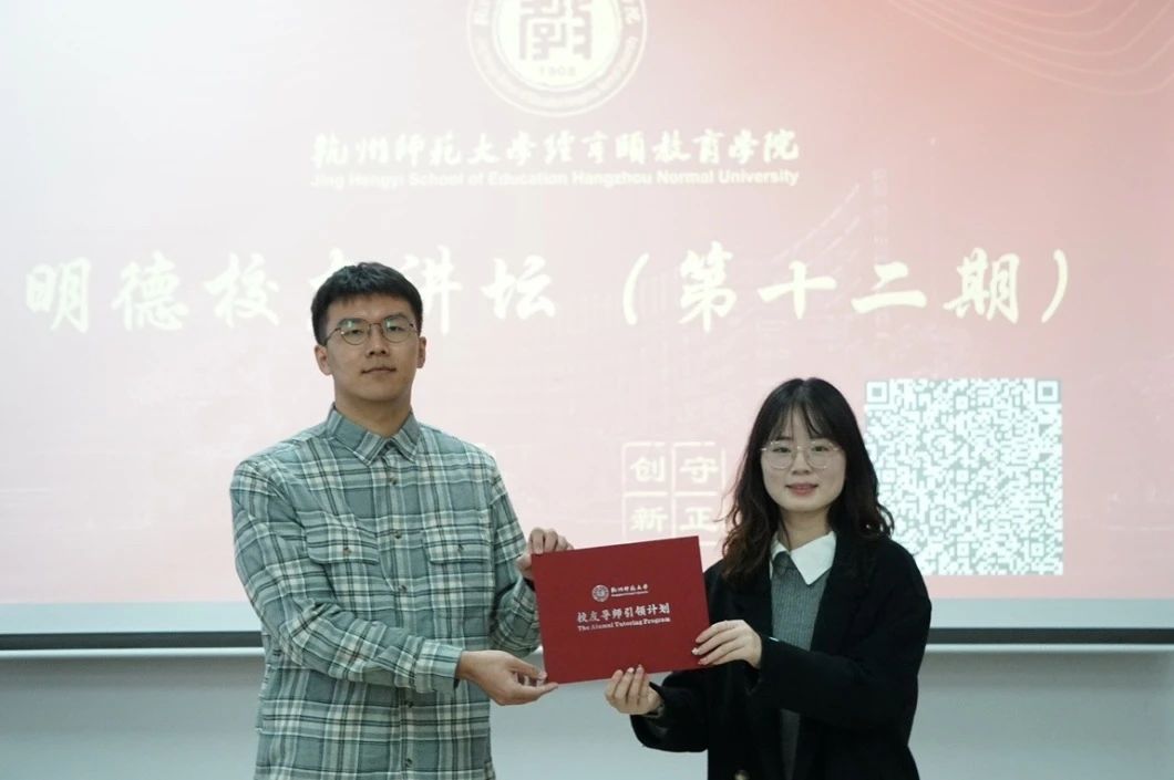 桃花族论坛 辅导员汪康琳为徐敬豪校友颁发了“校友导师引领计划”讲师团聘书。