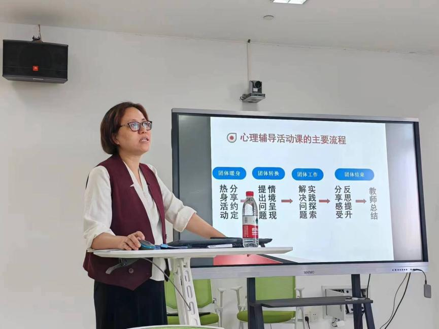 最后,冯老师结合课例向同学们讲解了心理辅导活动课的团体暖身、转换、工作及结束4个阶段的内容重点、设置的意义以及注意事项。提到在团体暖身阶段主要是进行热身活动、分享约定,对学生的探询要适度,并且要提醒学生遵守课堂公约;在团体转换阶段应当提出问题,进行情境呈现,为辅导主题做铺垫;在工作阶段,通过倾听、面质、共情等多种技术,引发学生的自发探索与问题探讨;在最后结束阶段要进行感受分享及反思提升,教师要进行总结升华。